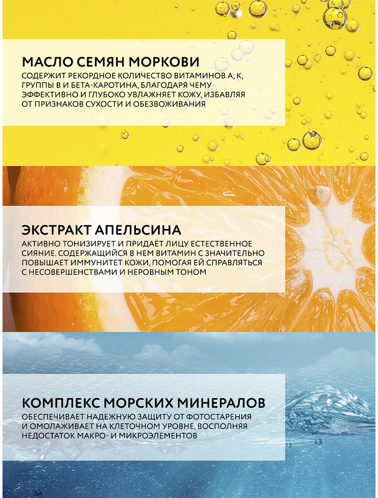 Dr. Sea Крем увлажняющий с маслом моркови и экстрактом апельсинаВ данный момент этот товар отсутствует в продаже. Возможно, у нас найдется аналогичный или похожий товар здесь. Кладезь более тридцати природных компонентов, в том числе витаминов A, B, C, D, E, K, минералов Мертвого моря, морковного масла и экстракта апельсина, входит в состав этого крема, насыщающая кожу полезными веществами, обеспечивая комплексное питание и поддерживая необходимый водный баланс увлажненности комбинированной кожи. Содержание морковного масла успокаивает; помогает противостоять вредному воздействию окружающей среды; активно питает и смягчает кожу, предотвращает шелушения и улучшает цвет лица. Экстракт апельсина устраняет блеск в Т-зоне, тонизирует, слегка осветляет кожу и повышает производительность коллагена. |