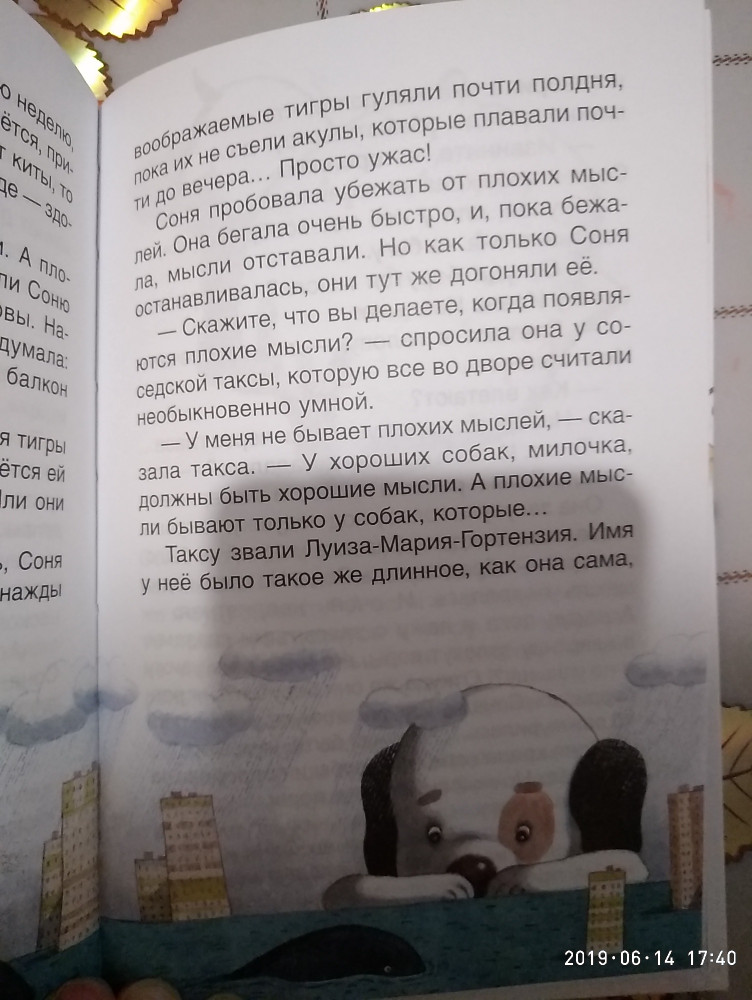 Книга отличная! Взяли восьмилетней дочке, она с удовольствием читает, смеётся и пересказывает нам истории про собачку Соню. Книга с картинками, читается легко.