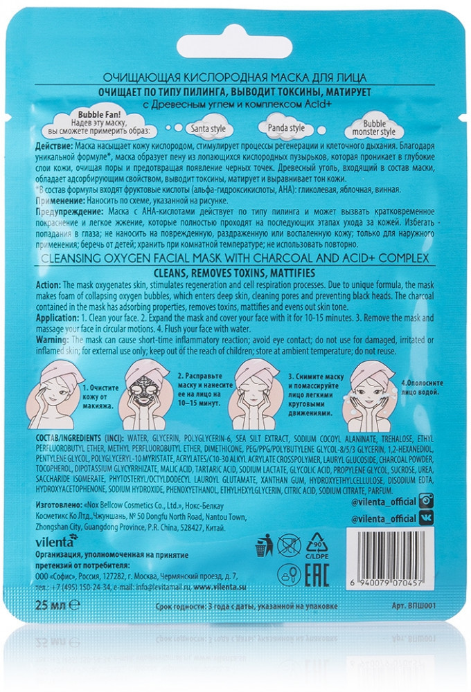 Vilenta Маска для лица очищающая кислородная «To Walk On Air» с Древесным углем и комплексом Acid+