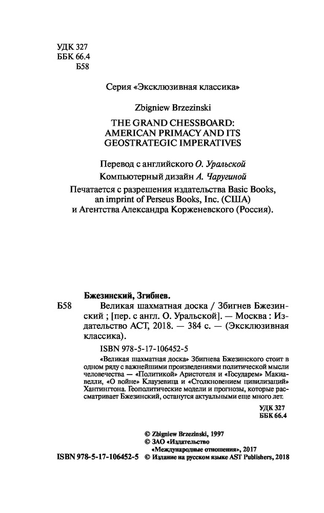 💳 Оплатить за товар можно при получении 🇰🇿 Есть бесплатная доставка по Казахстану 🎁 Копите бонусы с каждой покупки Серия: Эксклюзивная классика «Великая шахматная доска» Збигнева Бжезинского стоит в одном ряду с важнейшими произведениями политической мысли человечества — «Политикой» Аристотеля и «Государем» Макиавелли, «О войне» Клаузевица и «Столкновением цивилизаций» Хантингтона. |