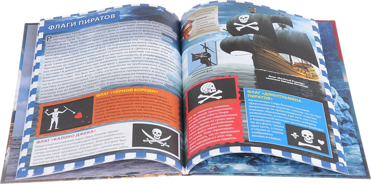 В книге кратко рассказывается про знаменитых пиратов, откуда пошло пиратство, какие у пиратов были корабли, о сокровищах, пиратских мифах и легендах. сСтраницы плотные, яркие иллюстрации. Хорошая книга, единственный минус - шрифт мелкий и на цветных страницах он трудно читаемый.