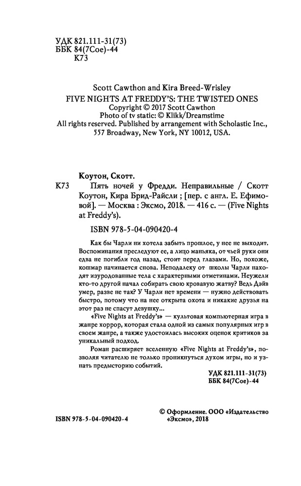 💳 Оплатить за товар можно при получении 🇰🇿 Есть бесплатная доставка по Казахстану от 1 дня 🎁 Копите бонусы с каждой покупки Серия: Five Nights at Freddy's Как бы Чарли ни хотела забыть прошлое, у нее не выходит. Воспоминания преследуют ее, а лицо маньяка, от чьей руки они едва не погибли год назад, стоит перед глазами. Но, похоже, кошмар начинается снова. Неподалеку от школы Чарли находят изуродованные тела с характерными отметинами. Неужели кто-то другой начал собирать свою кровавую жатву? Ведь Дэйв умер, разве не так? У Чарли нет времени — нужно действовать быстро, потому что на нее открыта охота и никакие друзья на этот раз не спасут девушку... |