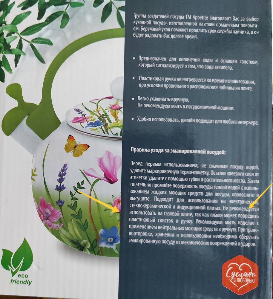 В карточке товара указано, что чайник предназначен для всех видов плит, ориентировалась на эту информацию при заказе. Но уже после покупки дома обратила внимание, что не рекомендуется использовать для газовых плит (фото прилагается), у меня газовая плита. Но это уже не к производителю.
