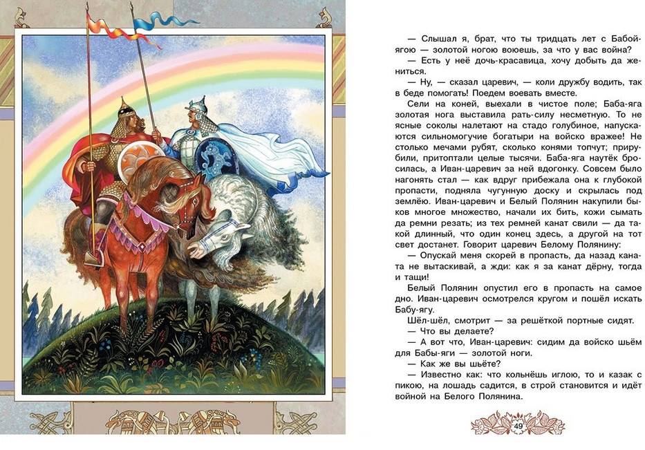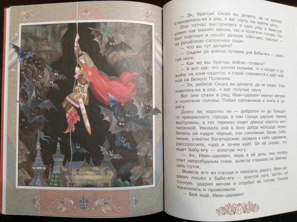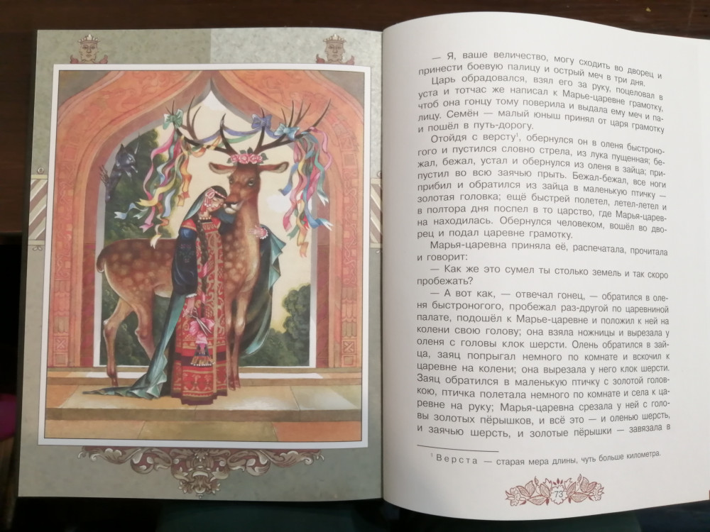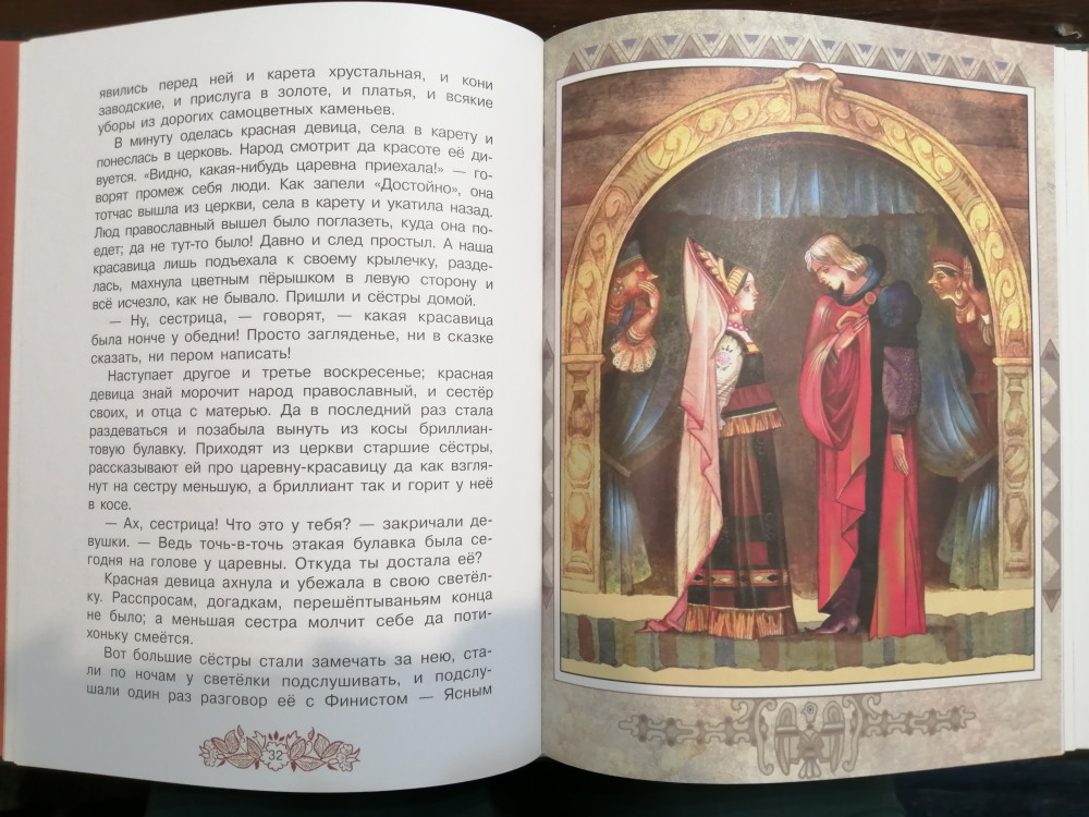 Отлично изданная книжка! Переплёт очень прочный, много красивых цветных реалистичных иллюстраций, страницы белые и плотные. В содержание включены сказки: "Гуси-лебеди", "Морозко", "Василиса Прекрасная", "Финист - ясный сокол", Иван -царевич и Белый Полянин", "Кощей Бессмертный", "Скорый гонец". Великолепная книжка!