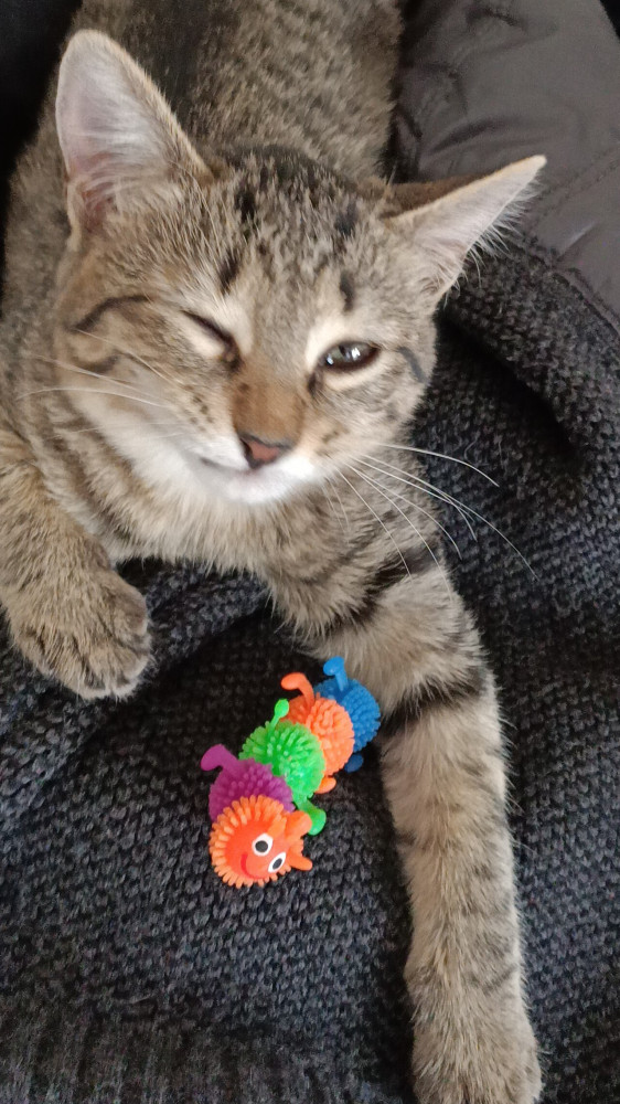 Гусеничка прелесть! Маленькая, милая, мягкая, яркая. Котенок играет, носит в зубках.