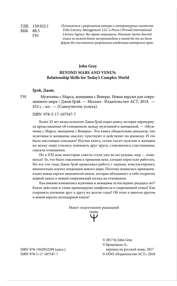 💳 Оплатить за товар можно при получении 🇰🇿 Есть бесплатная доставка по Казахстану 🎁 Копите бонусы с каждой покупки Серия: Самоучитель успеха Более 25 лет назад психолог Джон Грэй издал книгу, которая перевернула представления об отношениях между мужчиной и женщиной, — «Мужчины с Марса, женщины с Венеры». Эта книга убедительно доказала, что мужчины и женщины мыслят, чувствуют и действуют по-разному. И это была настоящая сенсация! Изучая книгу, сотни тысяч мужчин и женщин по всему миру учились понимать друг друга, становились счастливыми, спасали отношения. |