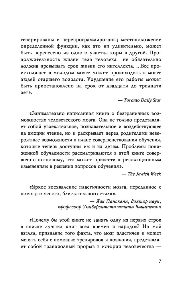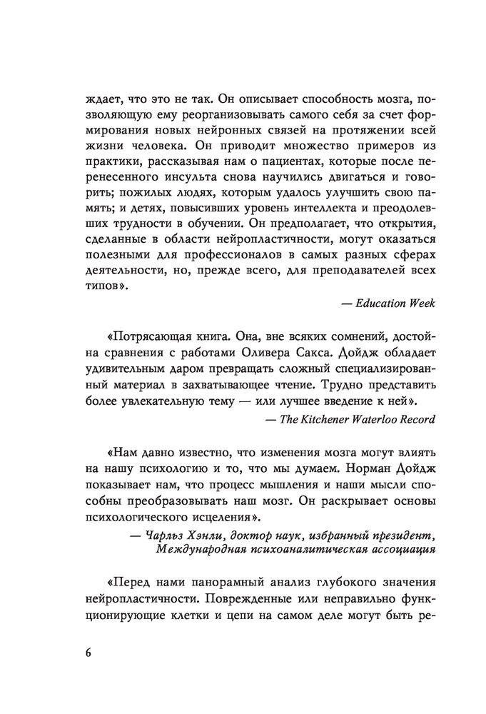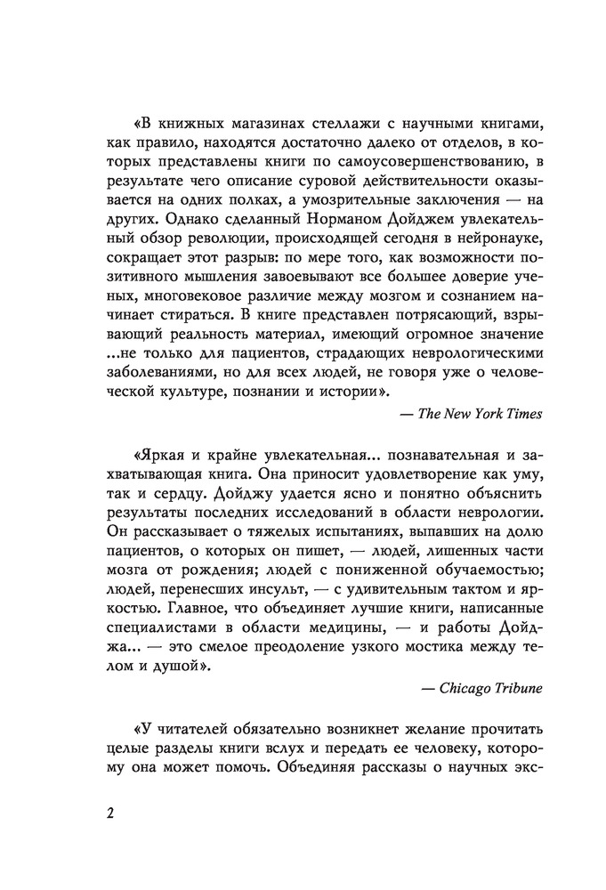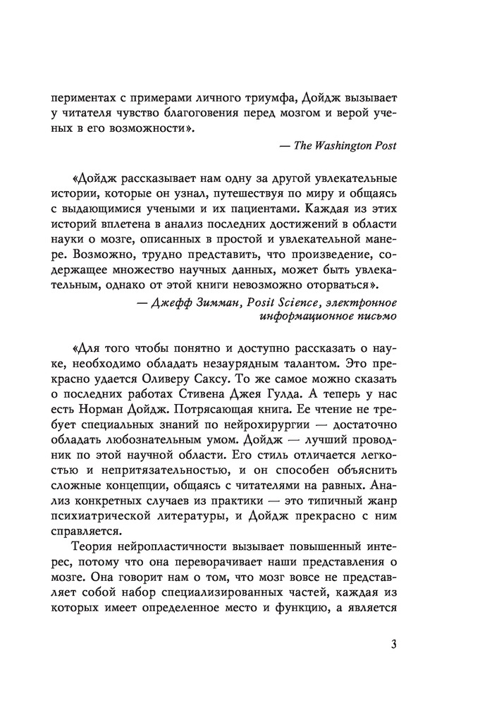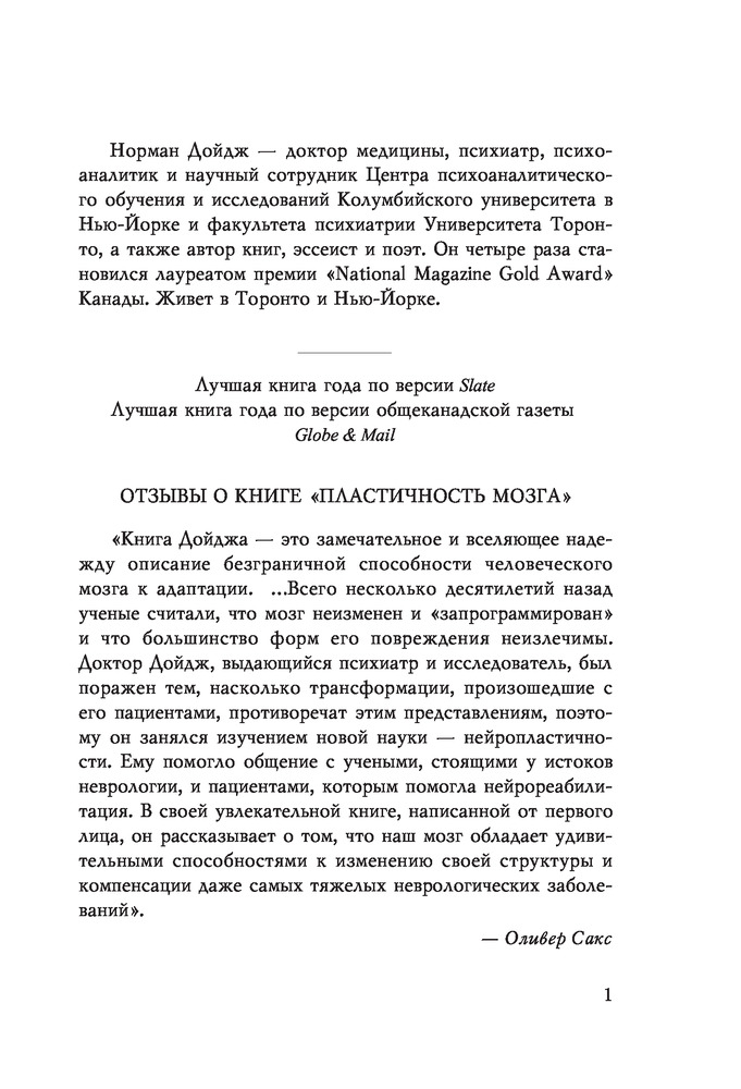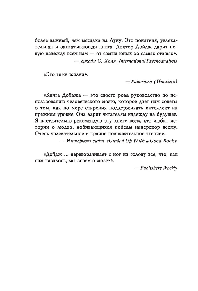 Услышав положительный отзыв от своего друга об этой книге решил прочитать её и не пожалел о выборе. Друг сразу предупредил что не все дочитывают эту книгу до конца и поэтому я уверенно "пробирался" через скучные и немного затянутые истории о врачах-исследователях. Несомненно, для меня было очень интересно узнать о том, что есть способы дать "зрение" слепым от рождения, вернуть к полноценной жизни людей испытавших инсульт с последствиями, ну и конечно, как изменить себя или свои привычки на основе знаний о пластичности мозга. Всё-таки хорошо сказал основатель современных олимпийских игр: "главное не победа, а участие, как и в жизни: главное не триумф, а борьба". Именно эта борьба с самим собой создает новый нейронные связи, вознаграждает нас достижениями, делает наш мозг (нас самих) моложе!