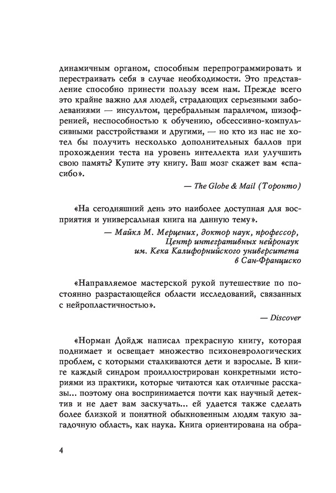 Пластичность мозга. Потрясающие факты о том, как мысли способны менять структуру и функции нашего моВ данный момент этот товар отсутствует в продаже. Возможно, у нас найдется аналогичный или похожий товар здесь. Серия: Джо Диспенза. Сила подсознания Эта книга рассказывает о революционном открытии в области изучения человеческого мозга, доказывающем его способность к самоизменению. В ней представлены истории об ученых, врачах и пациентах, которые смогли добиться удивительных трансформаций. Всем им удалось, без оперативного вмешательства или применения медикаментов, использовать ранее не известную способность мозга к изменениям.Открытие того, что мозг способен менять собственную структуру и функционирование, благодаря мыслям и действиям человека , — самое важное нововведение в наших представлениях о человеческом мозге, начиная с тех пор, как впервые была обрисована в общих чертах его анатомия и работа его основной структурной единицы — нейрона. Это — революция! И она будет иметь принципиально важные последствия. Эта книга одной из первых познакомила читателей с открывшимися возможностями мозга. |