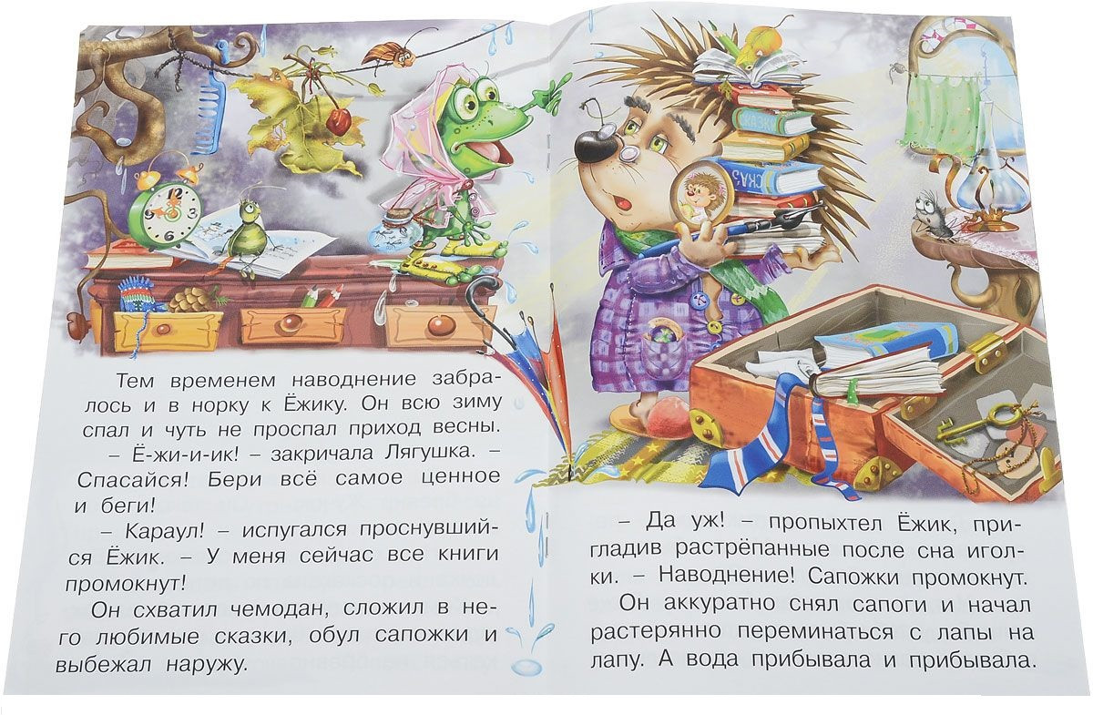 Книжка без переплёта, но странички ламинированные, поэтому достаточно прочные для такого издания. Странички белые, иллюстрации очень красивые и большие. Текст интересный, о том, как зверюшки все вместе спасались от наводнения. (Немножко напоминает сказку Теремок). Хорошая книжка, красивая и интересная.