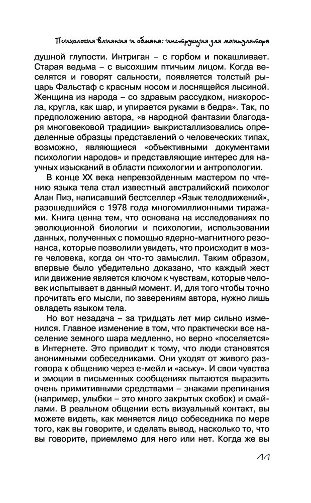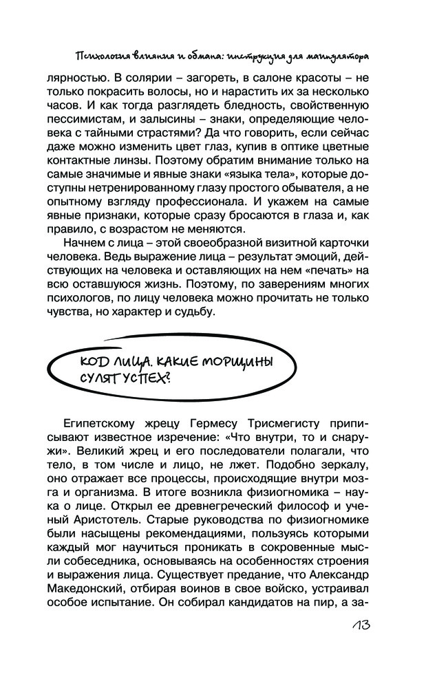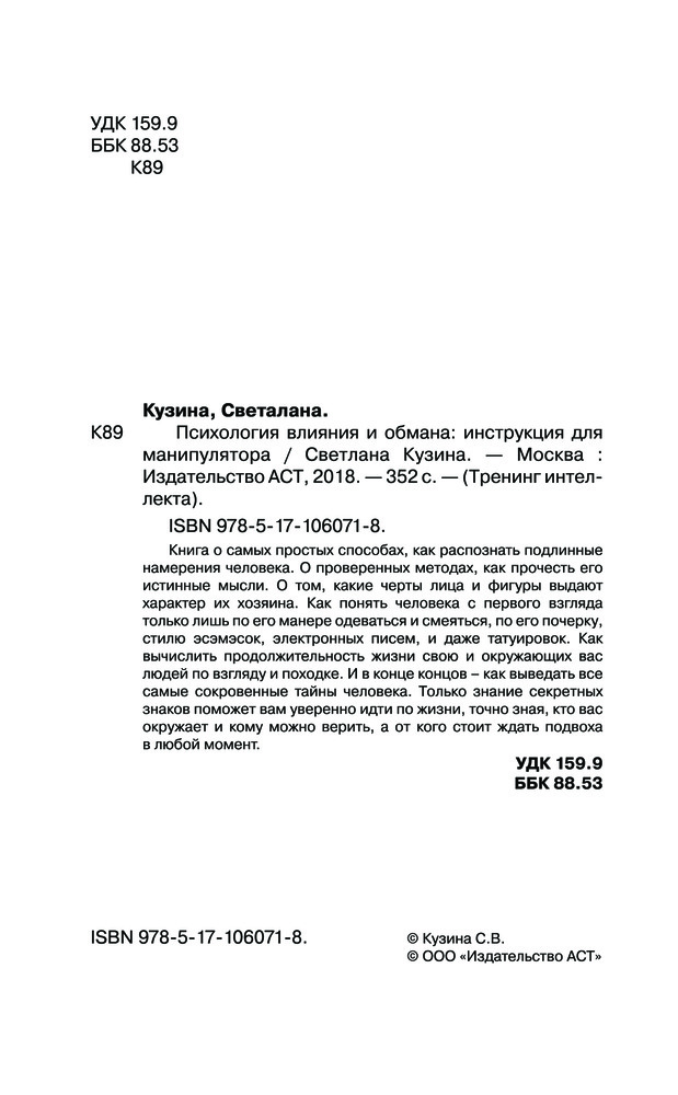 Психология влияния и обмана: инструкция для манипулятораВ данный момент этот товар отсутствует в продаже. Возможно, у нас найдется аналогичный или похожий товар здесь. Серия: Тренинг интеллекта ?Книга о самых простых способах, как распознать подлинные намерения человека. О проверенных методах, как прочесть его истинные мысли. О том, какие черты лица и фигуры выдают характер их хозяина. Как понять человека с первого взгляда только лишь по его манере одеваться и смеяться, по его почерку, стилю эсэмэсок, электронных писем, и даже татуировок. Как вычислить продолжительность жизни свою и окружающих вас людей по взгляду и походке. И в конце концов — как выведать все самые сокровенные тайны человека. Только знание секретных знаков поможет вам уверенно идти по жизни, точно зная, кто вас окружает и кому можно верить, а от кого стоит ждать подвоха в любой момент. |