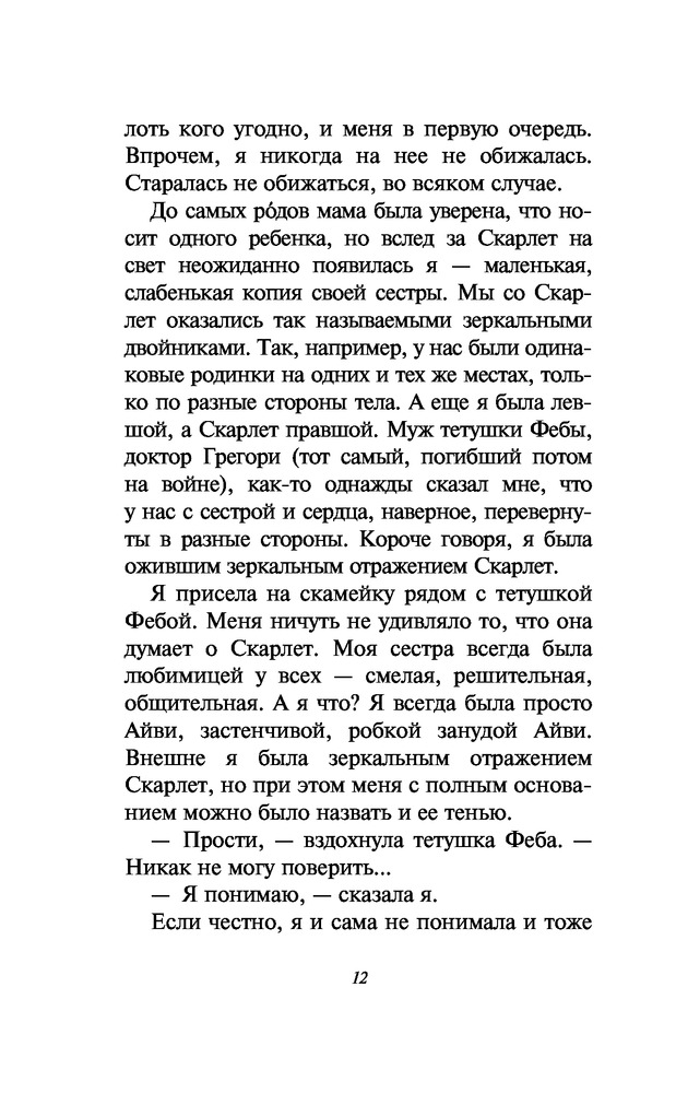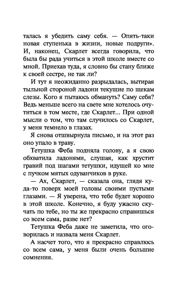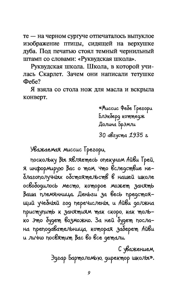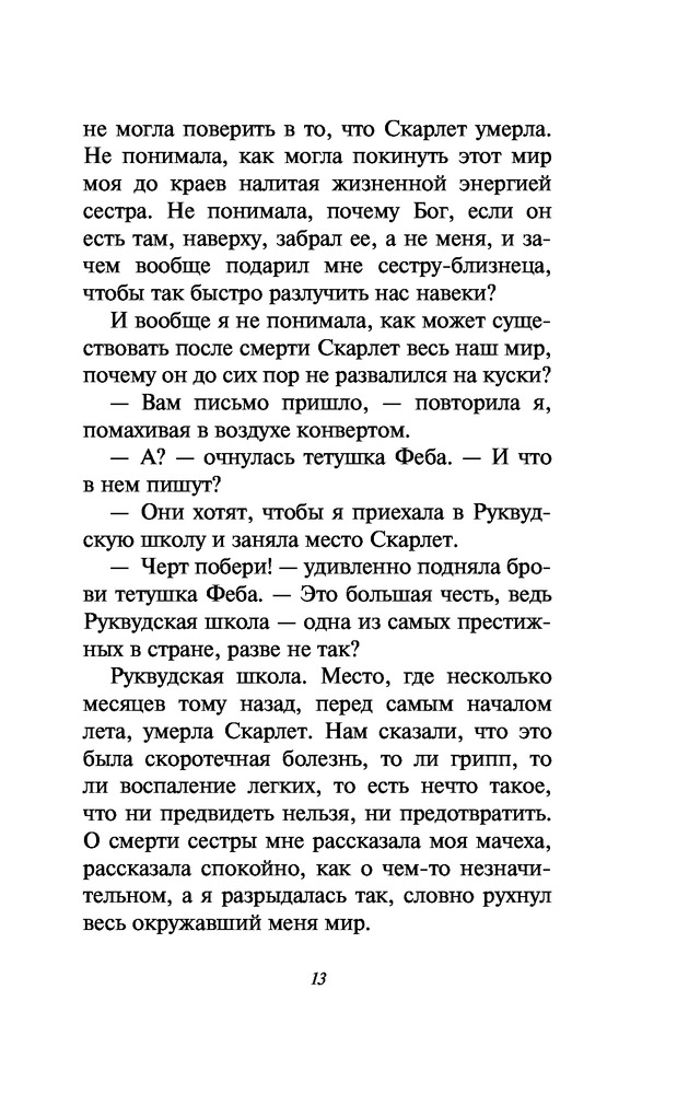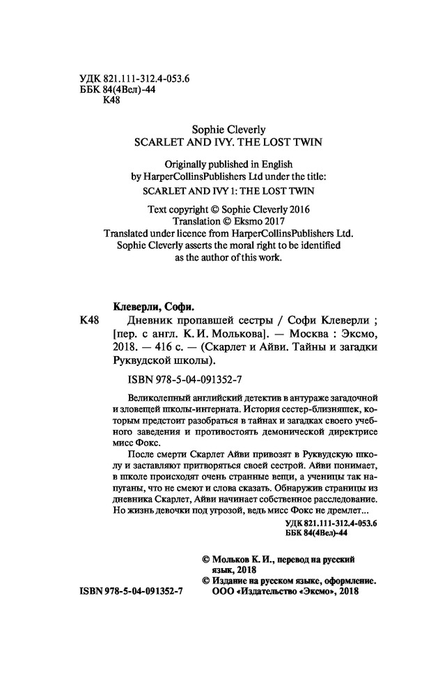 Я читала давно, года полтора назад. Решила всё-таки оставить отзыв, чтобы другие люди могли ориентироваться. Мне сейчас 12, пишу с аккаунта мамы. Читала когда было 10. У меня тогда была ужасная техника чтения и я прочла эту книгу за четыре месяца. Взяла недавно эту книжку перечитать, прочла за один вечер. Сюжет интересный, дыр не замечала. Если есть родители, которым это принципиально: да, жестокие моменты есть, но не много. Например где мисс Фокс наказывает учеников поркой. Это подростковый детектив, в котором девочка по имени Айви Грей попадает в Руквудскую школу заместо ее погибшей сестры-близнеца Скарлет. Сюжет спойлерить не буду, но прочитать советую. Я не могу прикрепить фото, потому что дала подруге почитать. Единственное что отвлекает, это крупный шрифт. Кстати, картинок нет, только в начале глав маленькие иллюстрации. Удачи с выбором!