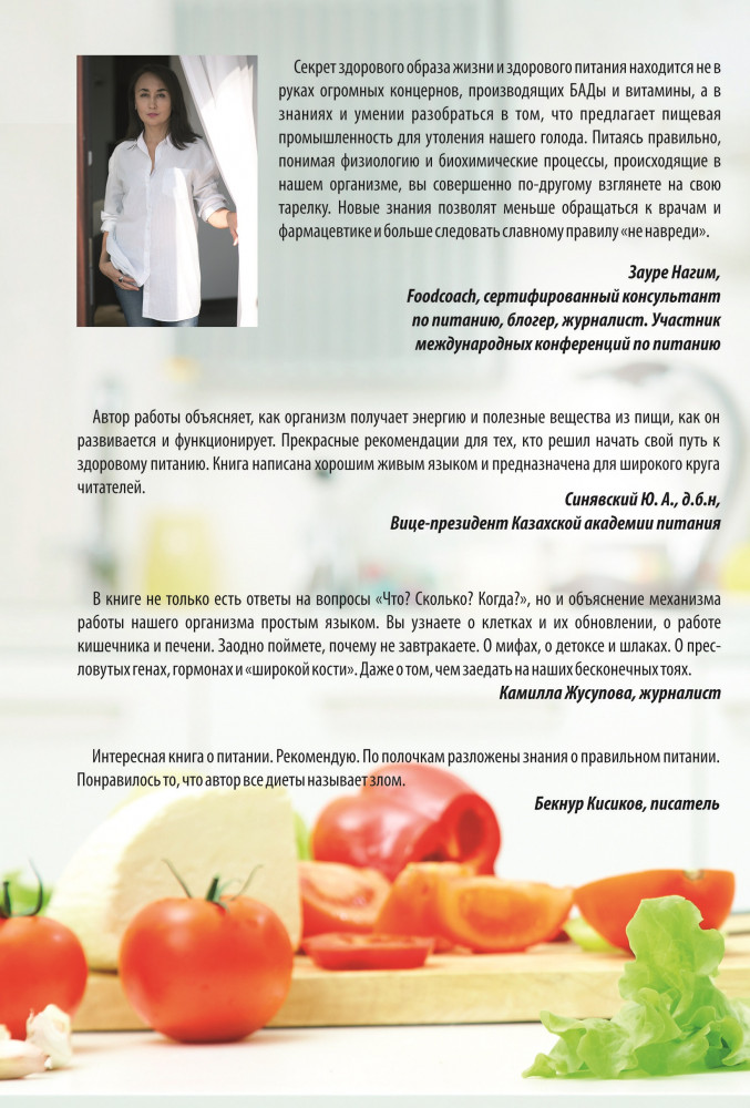 В наше время правильное питание стало таким запутанным, что иногда руки опускаются чтобы понять где правда, а где преувеличение. И разобраться что такое правильное питание с научной точки зрения поможет моя книга «Что? Сколько? Когда?». В своей книге я даю очень простые советы : Что есть из того, что вы уже едите, лучше для вашего здоровья. Сколько есть чтобы не навредить вашей фигуре. И Самое главное, когда есть , чтобы ваш организм стал крепче и моложе. Абсолютно никаких диет. Простые советы на научных фактах. Книга рекомендована к прочтению Вице Президентом Казахской Академией Питания Республики Казахстан Синявским Юрием Александровичем. Начинайте готовится к весне уже сейчас!