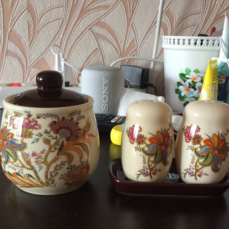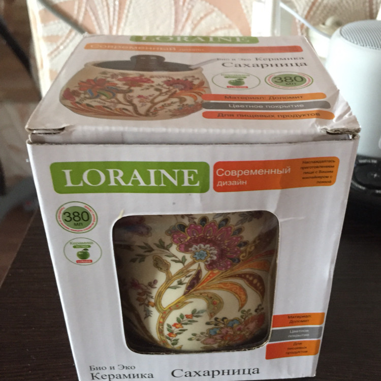 Рисунок красивый, только непонятно почему производитель не прокрасил его снизу. Качество вроде норм для своей цены, хотя ожидала лучше. Все-таки объём маловат, сравнила размер с солянкой, по фото видно, что сахарница не намного выше. Коробка немного потрепалась.