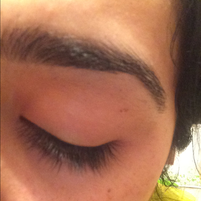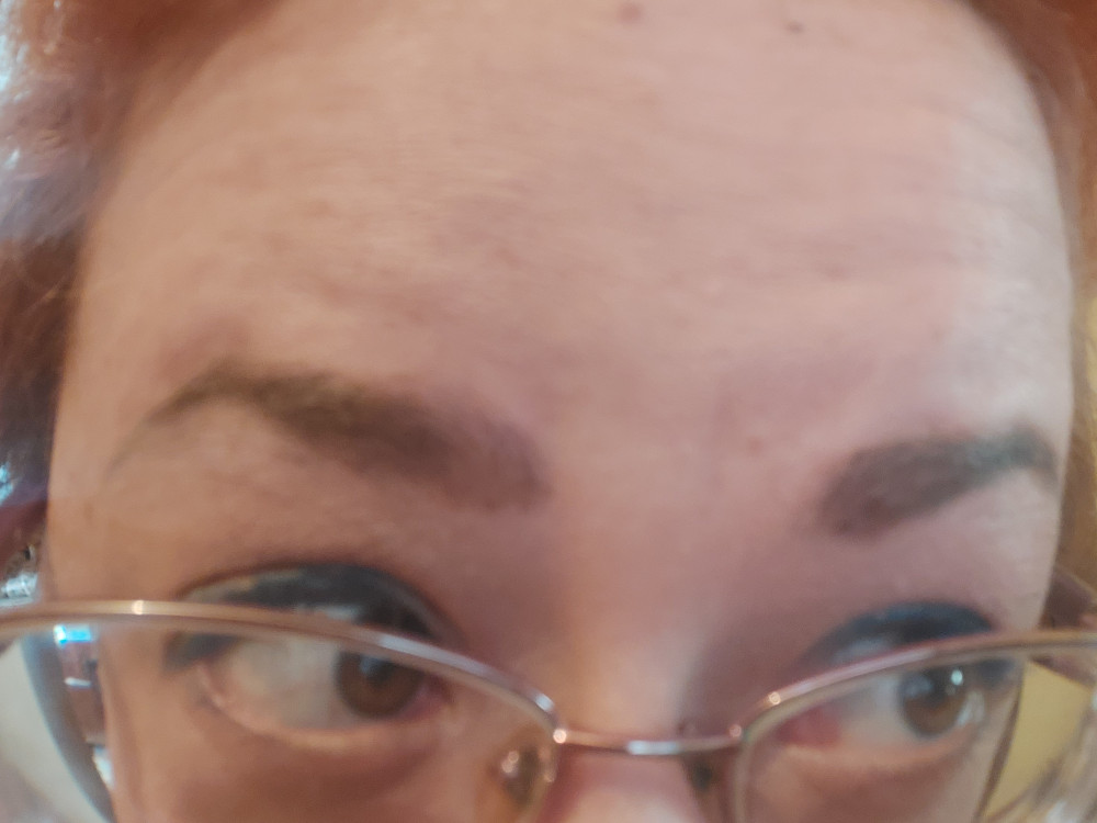Меня предупреждали, что цвет темнее будет, поэтому под свои чёрные брови взяла темно коричневый оттенок. Но он чёрный. Надо приноровиться к кисточке. Не скажу что прям весь день держит форму, но пойдёт.