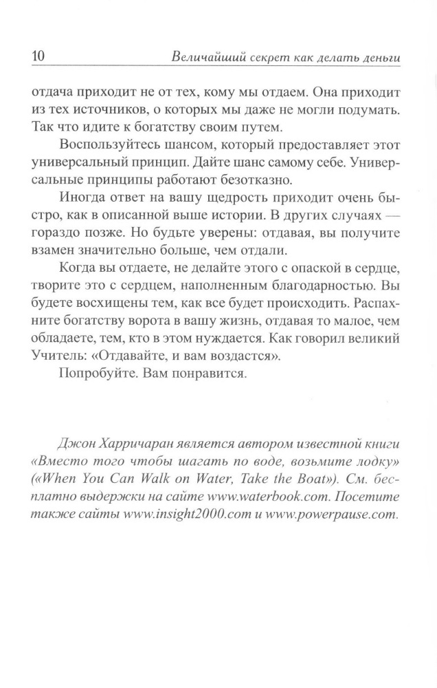 Книга вдохновляет и мотивирует на саморазвитие. В ней описаны материальные вещи (в том числе, как нужно зарабатывать деньги), с точки зрения духовных законов (закон благодарности). Книга просто обалденная! Рекомендую к прочтению.