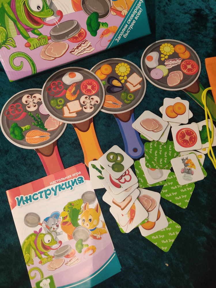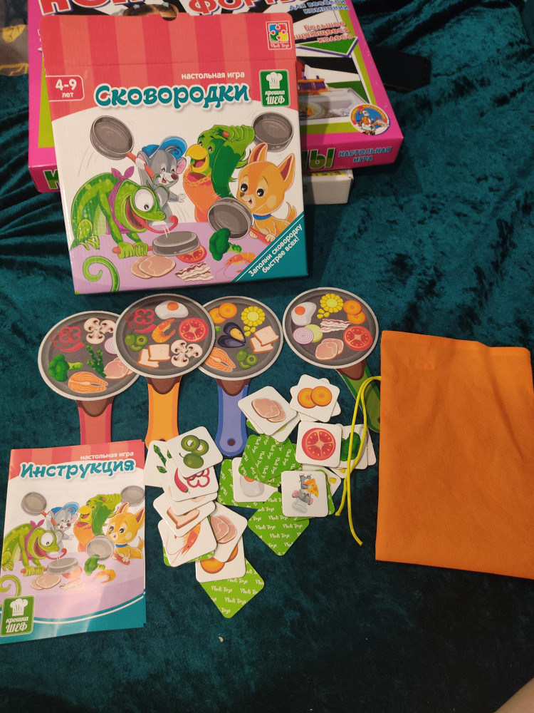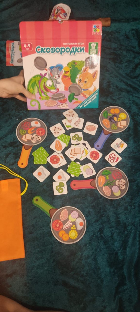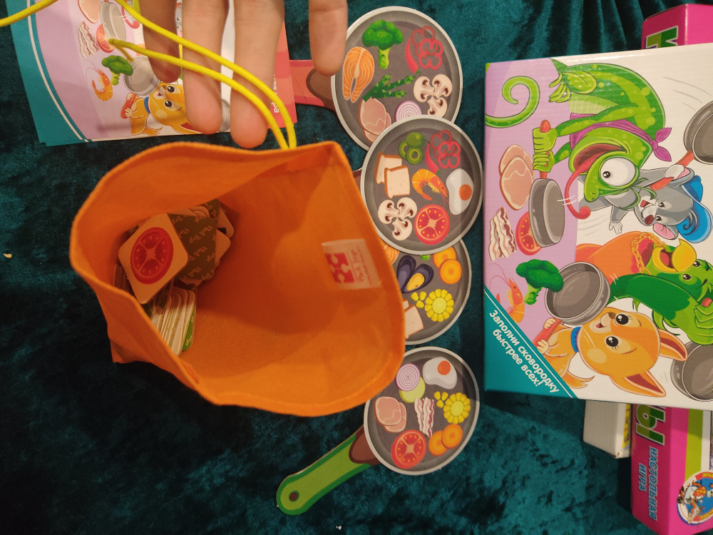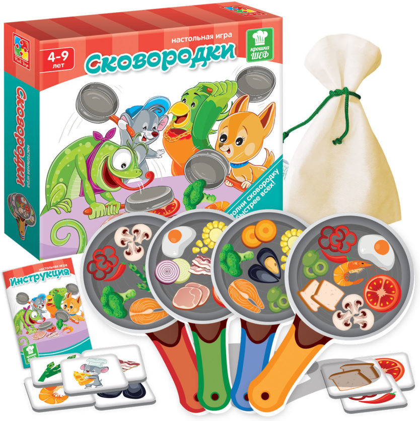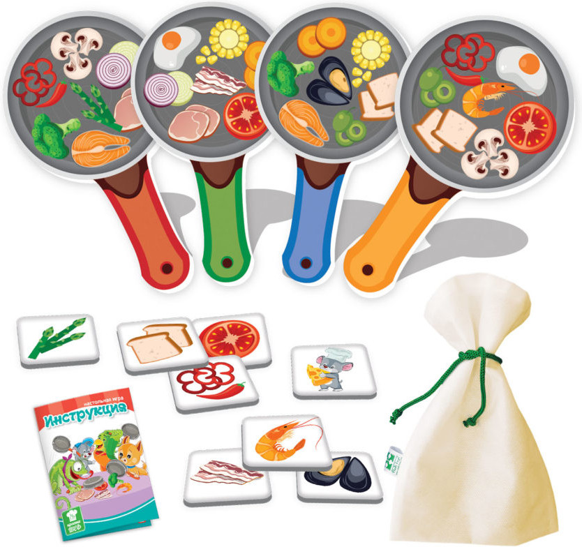 Комплект: 4 сковородки, карточки с рисунками еды, мешочек.