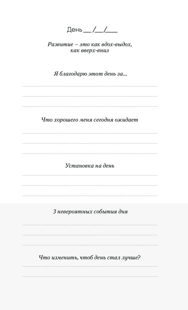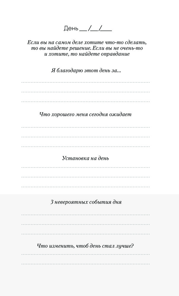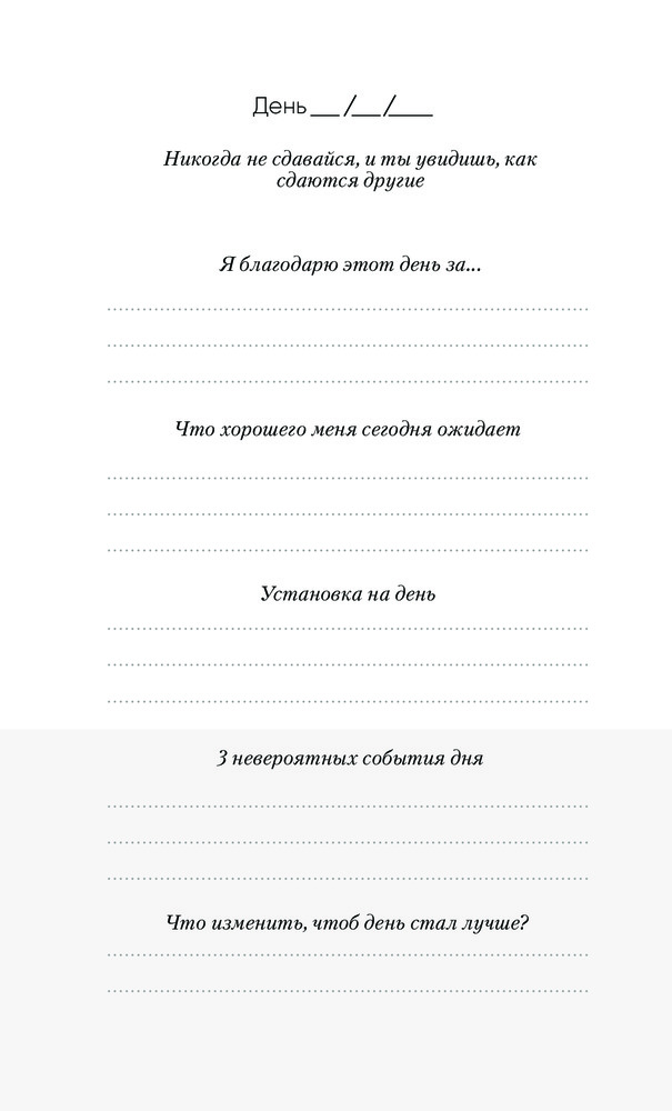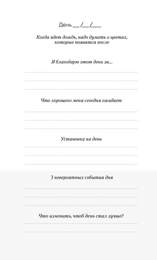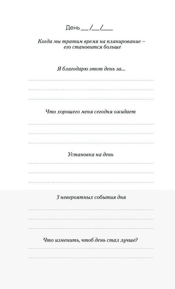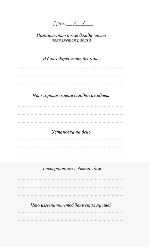 Ничего лишнего, реально уходит 5 минут в день, а изменения в восприятии уже заметны. Фокусируешься на хорошем и видишь больше хорошего) отличный инструмент!