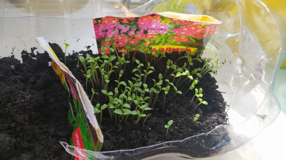Посадила семена в обрезанную бутылку, сверху накрыла чашкой, чтобы как парник было внутри. Посадила в воскресенье вечером, в четверг (4 день) был уже отличный всход.