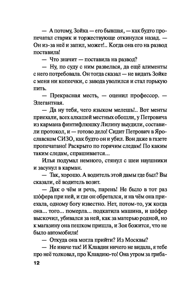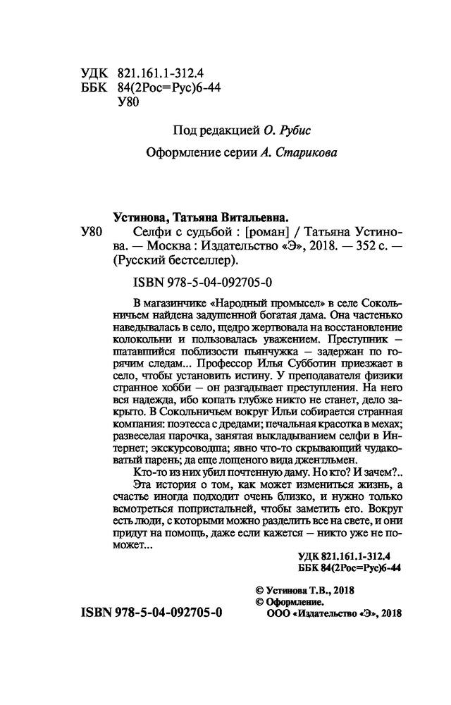 Селфи с судьбойВ данный момент этот товар отсутствует в продаже. Возможно, у нас найдется аналогичный или похожий товар здесь. Серия: Русский бестселлер (мяг) В магазинчике «Народный промысел» в селе Сокольничьем найдена задушенной богатая дама. Она частенько наведывалась в село, щедро жертвовала на восстановление колокольни и пользовалась уважением. Преступник — шатавшийся поблизости пьянчужка — задержан по горячим следам... Профессор Илья Субботин приезжает в село, чтобы установить истину. У преподавателя физики странное хобби — он разгадывает преступления. На него вся надежда, ибо копать глубже никто не станет, дело закрыто. В Сокольничьем вокруг Ильи собирается странная компания: поэтесса с дредами; печальная красотка в мехах; развеселая парочка, занятая выкладыванием селфи в Интернет; экскурсоводша; явно что-то скрывающий чудаковатый парень; да еще лощеного вида джентльмен. Кто-то из них убил почтенную даму. Но кто? И зачем?.. Эта история о том, как может измениться жизнь, а счастье иногда подходит очень близко, и нужно только всмотреться попристальней, чтобы заметить его. Вокруг есть люди, с которыми можно разделить все на свете, и они придут на помощь, даже если кажется — никто уже не поможет. |