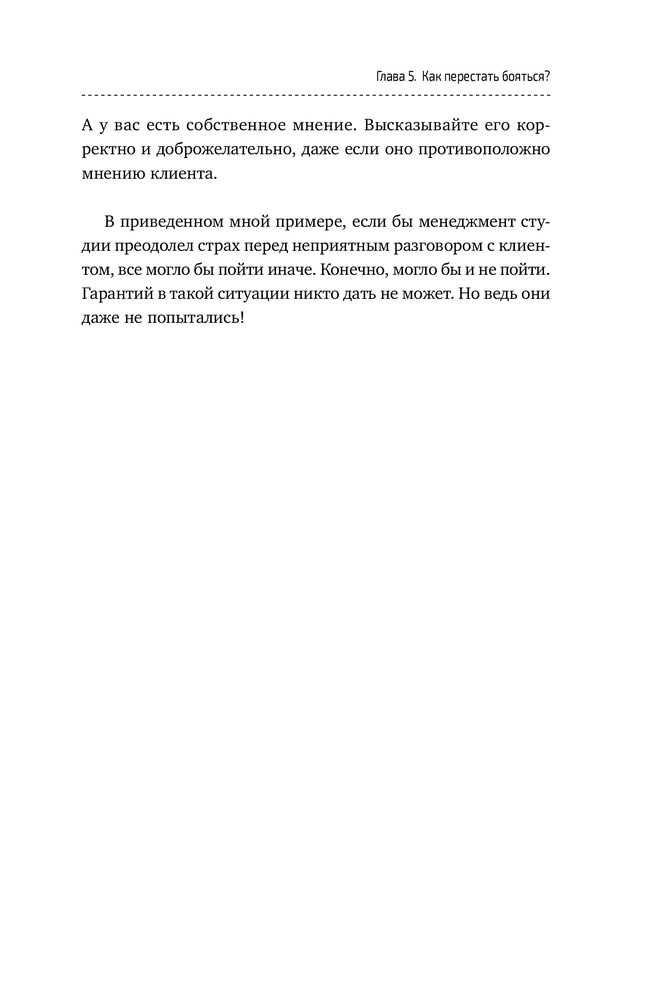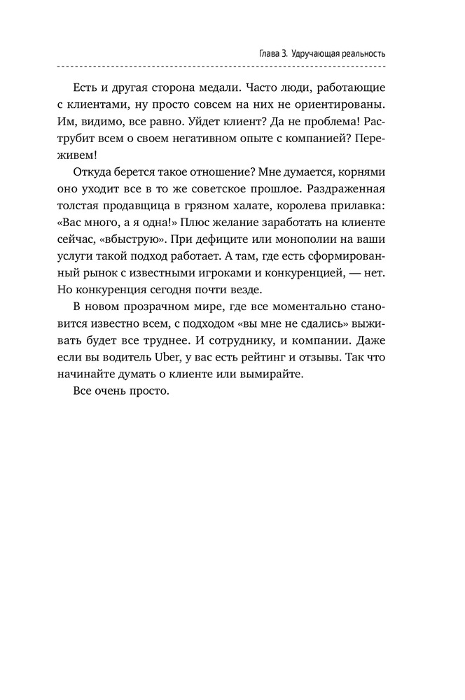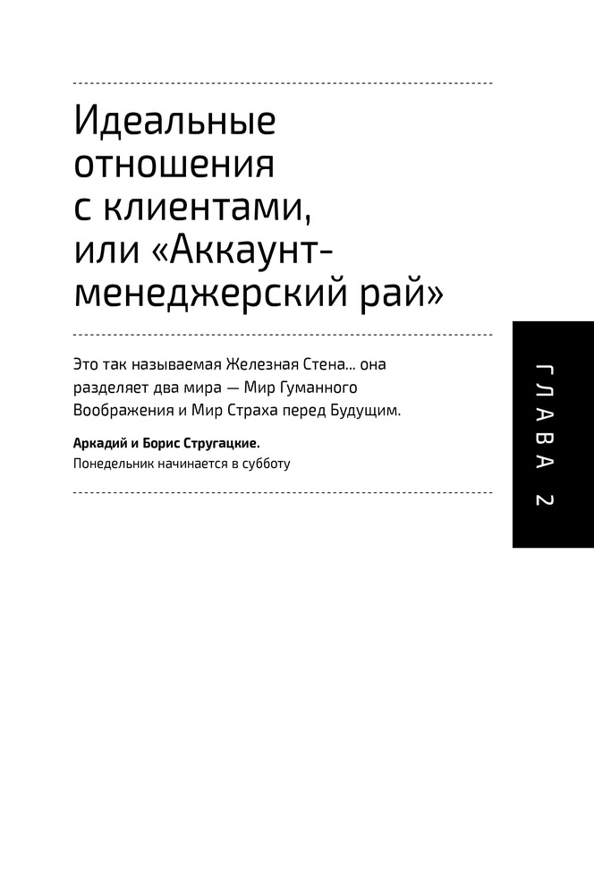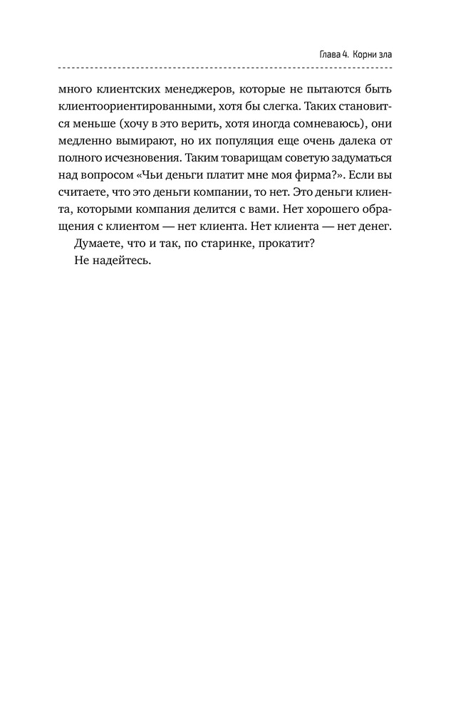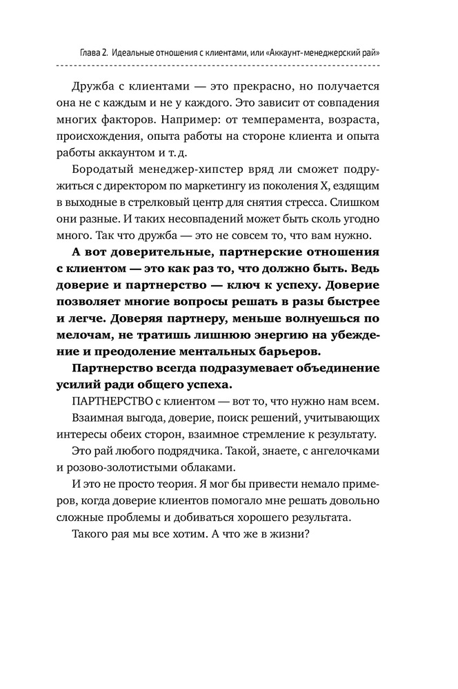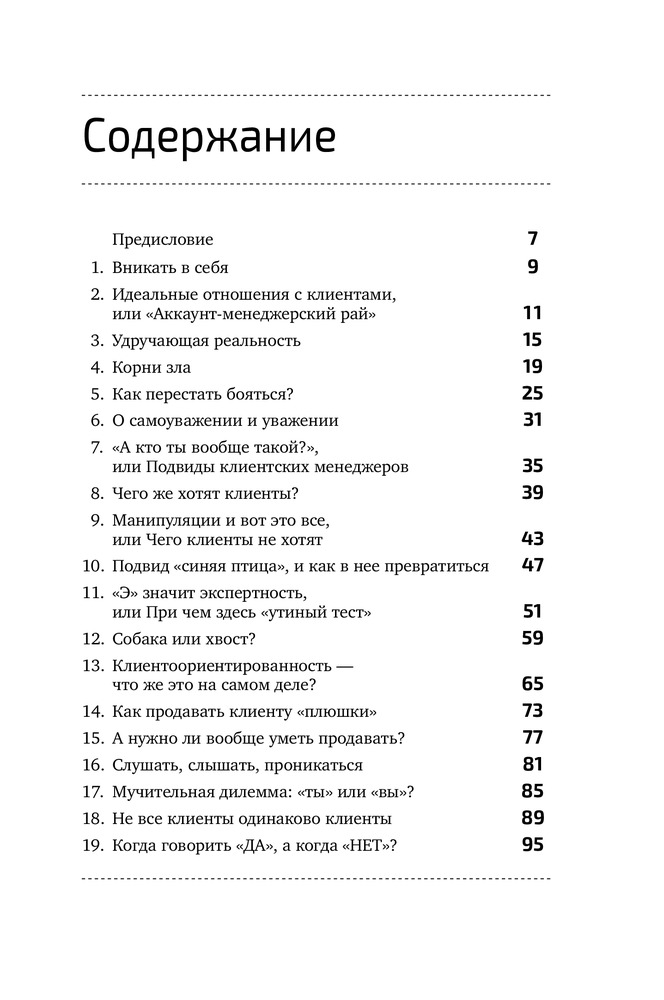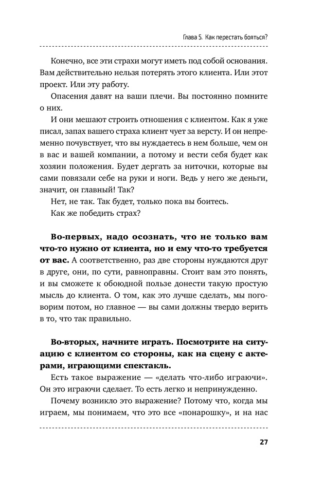 Сказать честно, ни одного дельного совета из книги извлечь не удалось. По сути, 10% книги - это советы из «7 навыков высокоэффективных людей», а остальное разбавлено водой от Капитана Очевидность. К примеру, «с клиентом нельзя проявлять мягкость и показывать слабость. Но и агрессивным быть не нужно. Вам нужно быть персиком - снаружи мягкий, а внутри твёрдая косточка». Все. На этом совет закончился ) Читается быстро. Само качество книги хорошее и есть закладка )