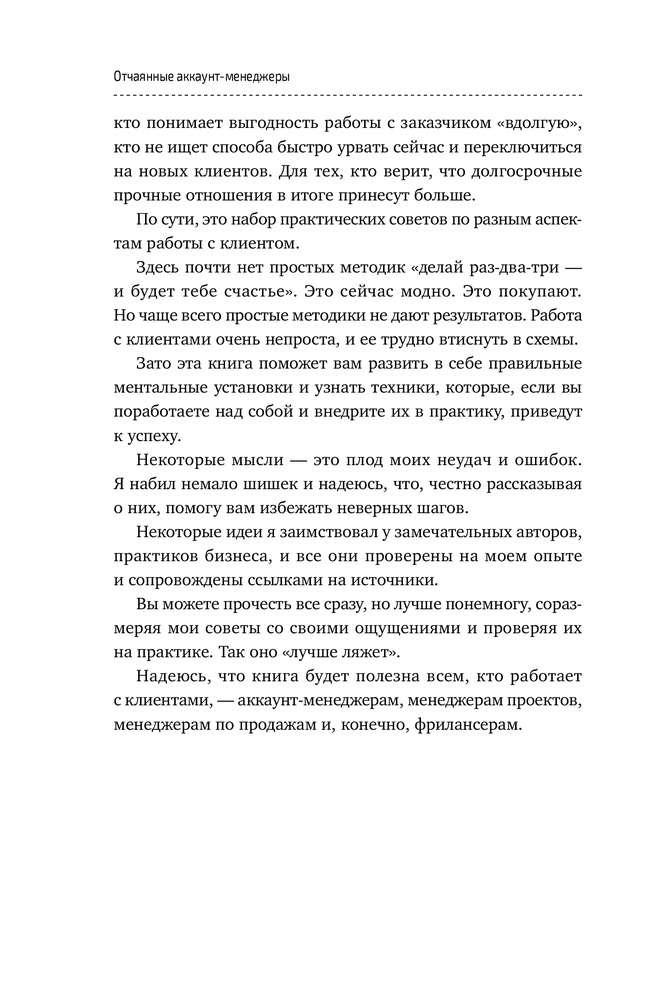 Отчаянные аккаунт-менеджеры. Как работать с клиентами без стресса и проблем. Настольная книга аккаунт-менеджера, менеджера проектов и фрилансера-40% +99 легко читается качественная полиграфия нет практических советов много воды заимствованный материал