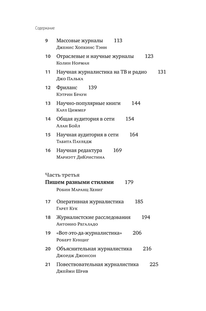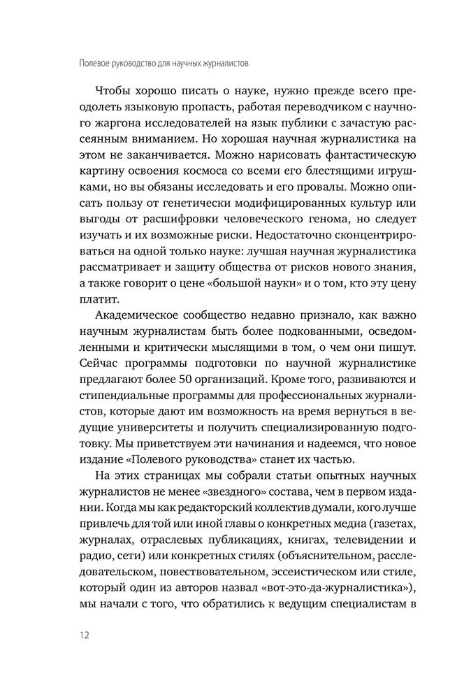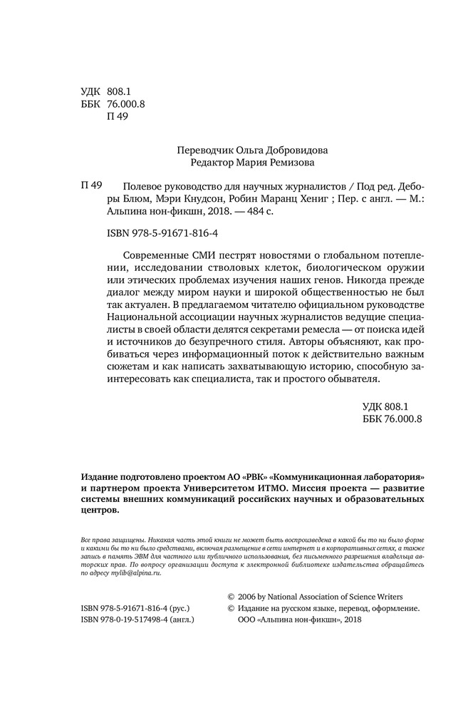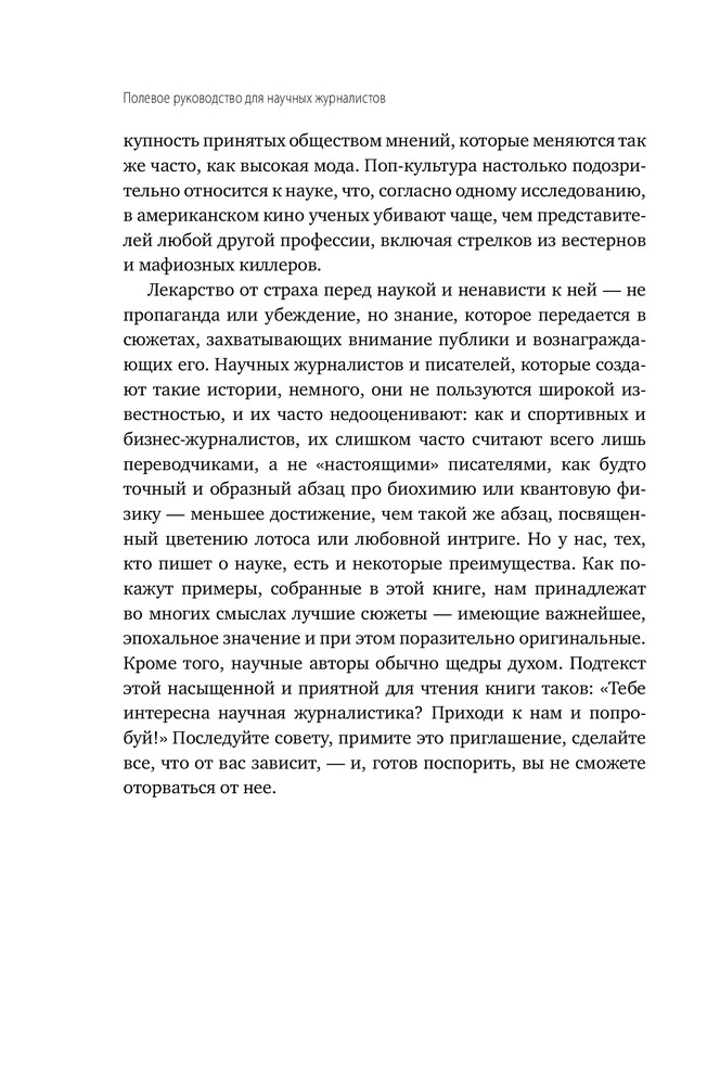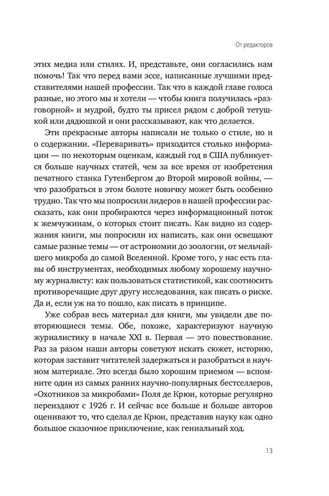 Современные СМИ пестрят новостями о глобальном потеплении, исследовании стволовых клеток, биологическом оружии или этических проблемах изучения наших генов. Никогда прежде диалог между миром науки и широкой общественностью не был так актуален. В предлагаемом читателю официальном руководстве Национальной ассоциации научных журналистов, ведущие специалисты в своей области, делятся секретами ремесла — от поиска идей и источников до безупречного стиля. Авторы объясняют, как пробиваться через информационный поток к действительно важным сюжетам и как написать захватывающую историю, способную заинтересовать как специалиста, так и простого обывателя. |