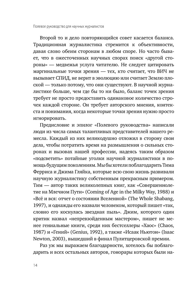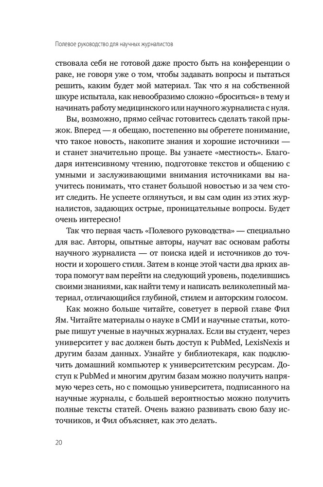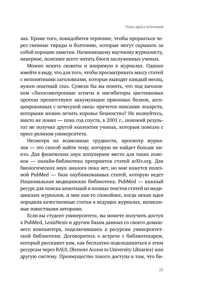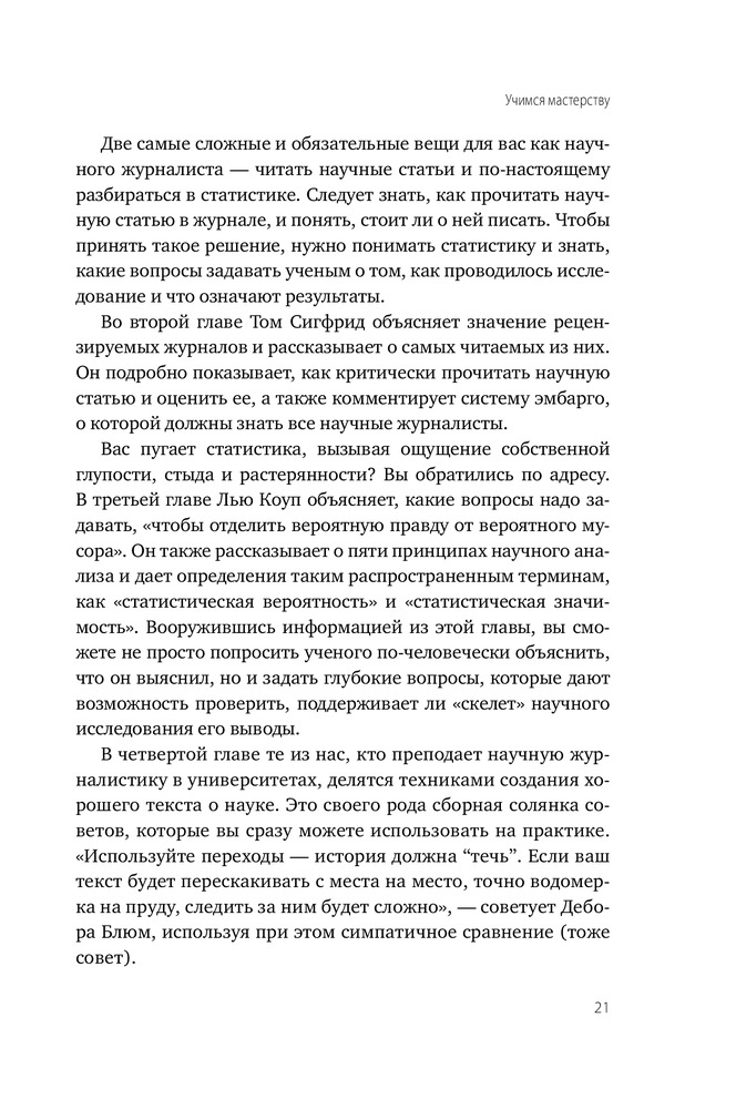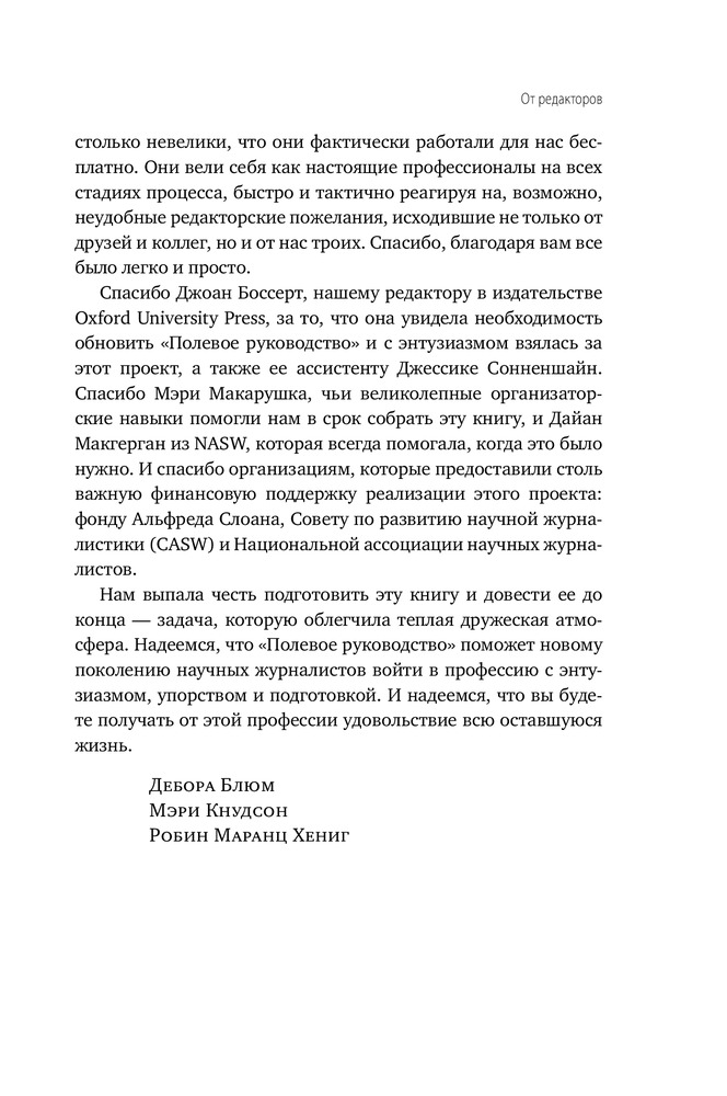 Современные СМИ пестрят новостями о глобальном потеплении, исследовании стволовых клеток, биологическом оружии или этических проблемах изучения наших генов. Никогда прежде диалог между миром науки и широкой общественностью не был так актуален. В предлагаемом читателю официальном руководстве Национальной ассоциации научных журналистов, ведущие специалисты в своей области, делятся секретами ремесла — от поиска идей и источников до безупречного стиля. Авторы объясняют, как пробиваться через информационный поток к действительно важным сюжетам и как написать захватывающую историю, способную заинтересовать как специалиста, так и простого обывателя. |