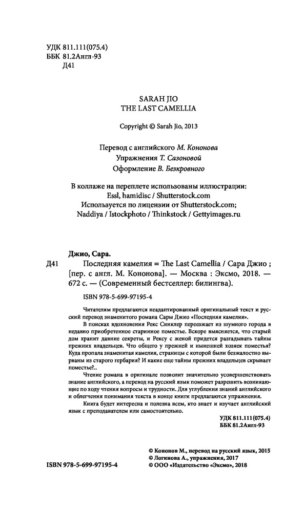 В данный момент этот товар отсутствует в продаже. Возможно, у нас найдется аналогичный или похожий товар здесь. Серия: Современный бестселлер. Билингва Эддисон считала, что только в ее прошлом скрывается мрачная тайна. Но когда они с мужем переехали в старинное поместье, выяснилось, что секреты есть и у старого дома. Что случилось со знаменитой камелией леды Анны? И какие еще драматичные события помнит старый особняк? Читайте захватывающий роман на двух языках — ведь оригинальный английский текст и русский перевод расположены на одном развороте! Упражнения в конце книги помогут лучше освоить новую лексику и полезные конструкции. Совершенствуйте свой английский!