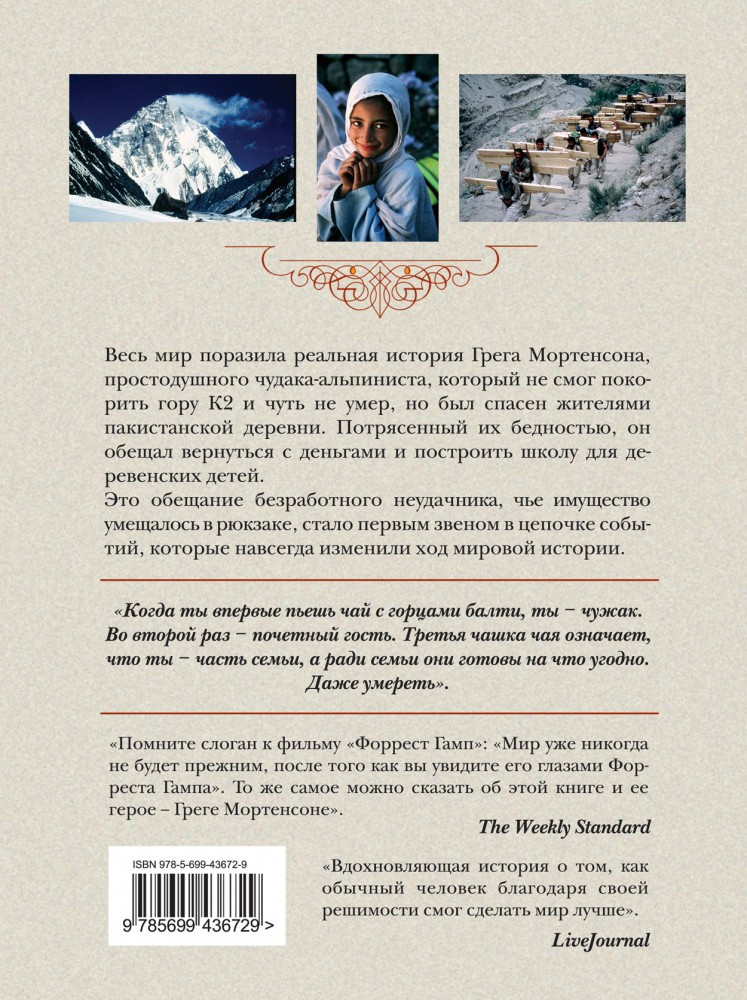 «Три чашки чая» — это поразительная история о том, как самый обычный человек, не обладая ничем, кроме решительности, способен в одиночку изменить мир. Грег Мортенсон подрабатывал медбратом, ночевал в машине, а свое немногочисленное имущество держал в камере хранения. В память о погибшей сестре он решил покорить самую сложную гору К2. Эта попытка чуть ли не стоила ему жизни, если бы не помощь местных жителей. Несколько дней, проведенных в отрезанной от цивилизации пакистанской деревушке, потрясли Грега настолько, что он решил собрать необходимую сумму и вернуться в Пакистан, чтобы построить школу для деревенских детей. Сегодня Мортенсон руководит одной из самых успешных благотворительных организаций в мире, он построил 145 школ и несколько десятков женских и медицинских центров в самых бедных деревнях Пакистана и Афганистана. Когда ты впервые пьешь чай с горцами балти, ты — чужак. Во второй раз — почетный гость. Третья чашка чая означает, что ты — часть семьи, а ради семьи они готовы на что угодно. Даже умереть. Книга была издана в 48 странах и в каждой из них стала бестселлером. Самого Грега Мортенсона дважды номинировали на Нобелевскую премию мира в 2009 и 2010 годах. |