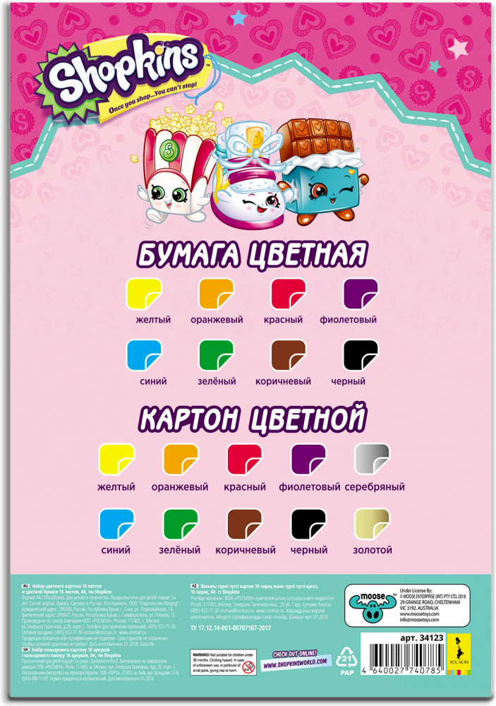 Shopkins Набор для творчества «Шопкинс», картон (10 л, 10 цв) + цветная бумага (16 л, 8 цв)В данный момент этот товар отсутствует в продаже. Возможно, у нас найдется аналогичный или похожий товар здесь. Набор для детского творчества «Шопкинс» формата А4 оптимально подходит для изготовления поделок дома, в детском саду и начальной школе. В упаковке 10 листов цветного мелованного картона, имеющего увеличенную плотность 230 г/м2, и 16 листов (8 цветов) бумаги, которая имеет оптимальную плотность 45 г/м2, без усилий режется, ровно сгибается и хорошо приклеивается. |