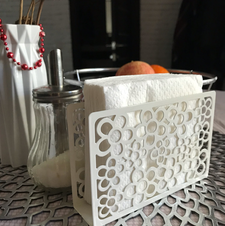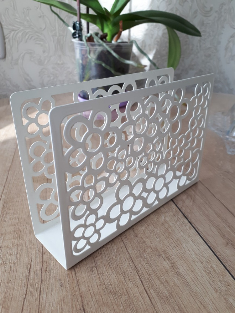 Очень долго искала салфетницу. У меня их много. Эту можно назвать идеальной. Во-первых, она металлическая значит устойчивая; во-вторых, вместительная по ширине; в-третьих, высота позволяет положить салфетки разного размера и не заморачиваться с укладкой ; в в-четвёртых, она окрашена в белый цвет, на стальных видны пятна, разводы. Ажурный стиль создаёт атмосферу праздника, лёгкости, белый цвет сочетается с любым цветом и рисунком салфеток.
