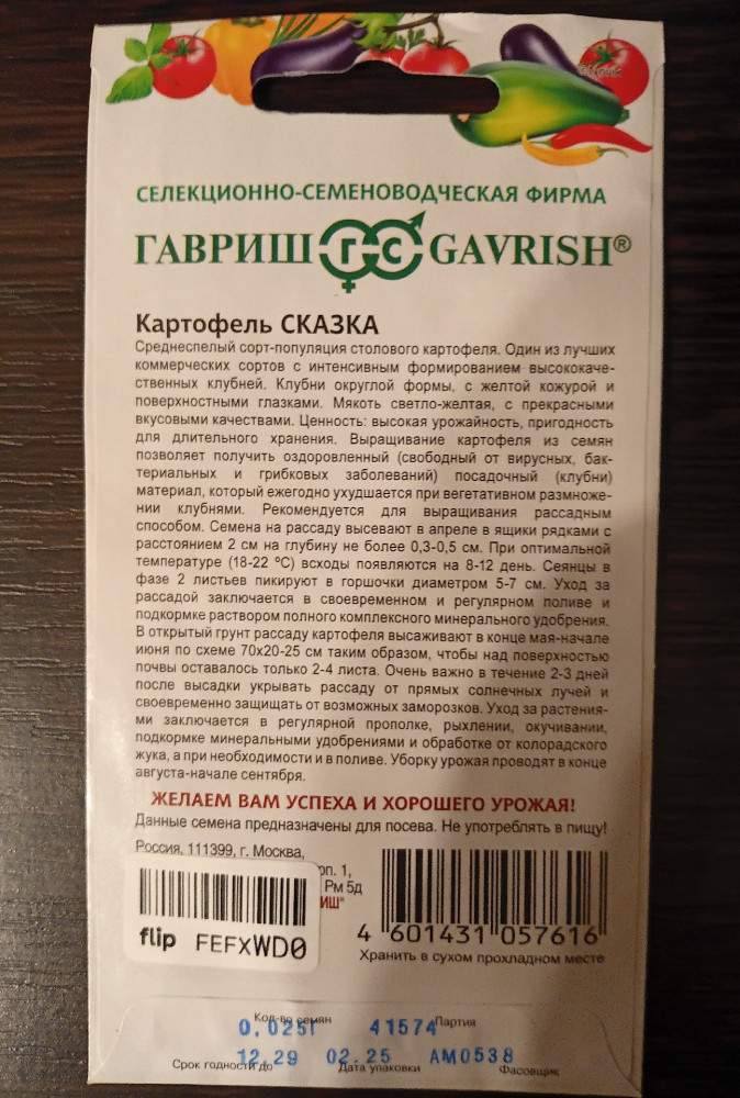 Гавриш Семена. Картофель «Сказка», 0,025 г-25% +11 высокая урожайность крупные клубни приятный вкус невсхожесть