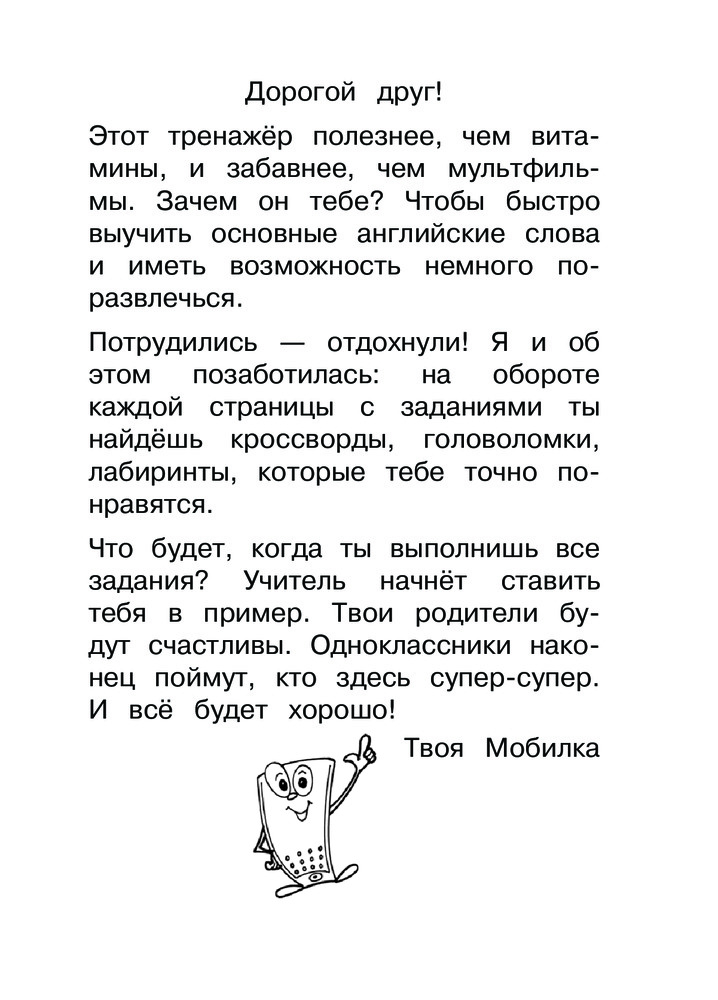 💳 Оплатить за товар можно при получении 🇰🇿 Есть бесплатная доставка по Казахстану от 1 дня 🎁 Копите бонусы с каждой покупки Серия: Мобильный тренажер. Нач. школа Тренажёр содержит упражнения, которые помогут расширить словарный запас английского языка. Постоянное повторение слов в различных типах заданий обеспечивает их быстрое запоминание и способствует автоматизации применения английской лексики в письменной и устной речи. Тренировочные задания сменяются развивающими и творческими, цель которых — сделать процесс изучения языка интересным и разнообразить его. Мотивирующие высказывания забавного персонажа Мобилки помогут учащемуся обрести уверенность или заставят просто улыбнуться. Пособие можно использовать при повторении и закреплении материала, при подготовке к контрольным и самостоятельным работам. |