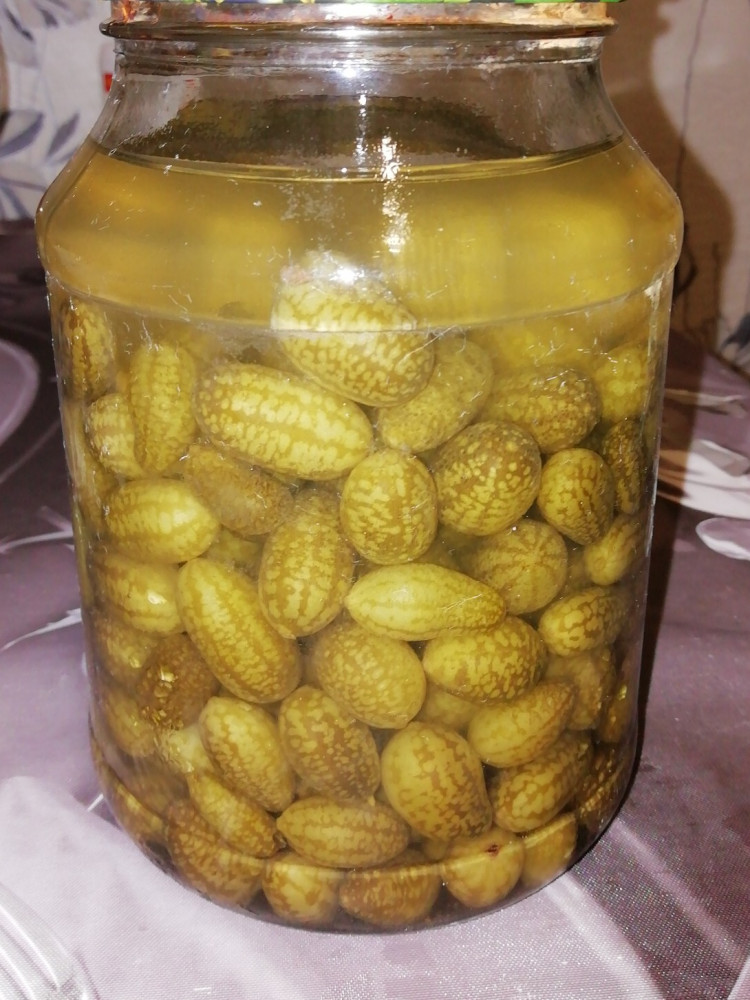 Не смотря на то что было холодное лето, собрала урожай, не много, небольшую чашку. Плоды маленькие, вкус огурца чуть с кислинкой. Засолила в маленькие баночки, буду открывать по праздникам.