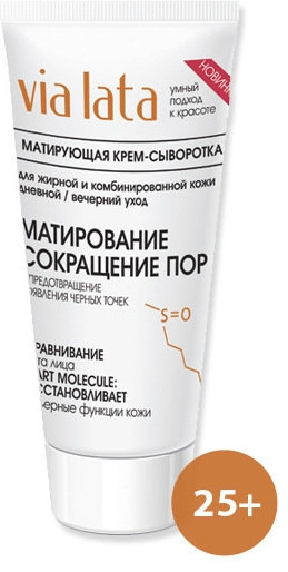 Via Lata Крем-сыворотка для лица матирующая 25+В данный момент этот товар отсутствует в продаже. Возможно, у нас найдется аналогичный или похожий товар здесь. Эффективность крем-сыворотки превосходит действие обычного крема в несколько раз, обеспечивает 100% рацион питания и увлажнение на 24 часа. Уникальная концепция Smart Molecule с биоактивными компонентами, сокращает поры и предотвращает появление черных точек. Тонкие морщинки уменьшаются, улучшается цвет лица. Содержит запатентованный наполнитель, сохраняющий матовость кожи, комплекс био-детокс с биофлавоноидами цитрусовых, алоэ и экстрактом плодов акебии, Д-пантенол, ценнейшее ферментированное масло семечек зеленого чая, масла миндаля и виноградных косточек. Природная защита от UV-излучения. |