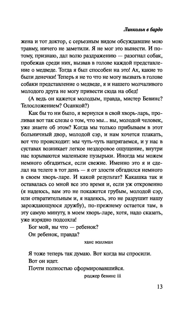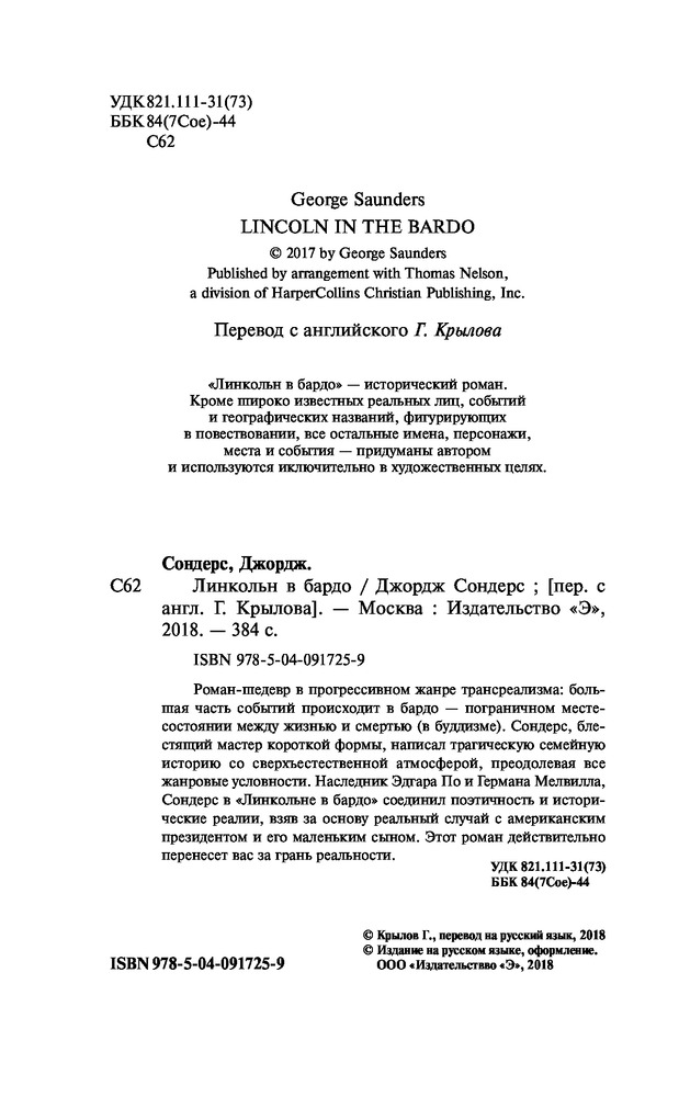 Линкольн в бардоВ данный момент этот товар отсутствует в продаже. Возможно, у нас найдется аналогичный или похожий товар здесь. Серия: Литературные хиты. Коллекция Роман-шедевр в прогрессивном жанре трансреализма: большая часть событий происходит в бардо -пограничном месте-состоянии между жизнью и смертью (в буддизме). Сондерс, блестящий мастер короткой формы, написал трагическую семейную историю со сверхъестественной атмосферой, преодолевая все жанровые условности. Наследник Эдгара По и Германа Мелвилла, Сондерс в «Линкольне в бардо» соединил поэтичность и исторические реалии, взяв за основу реальный случай с американским президентом и его маленьким сыном. Этот роман действительно перенесет вас за грань реальности. |