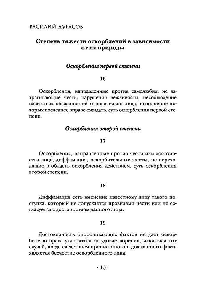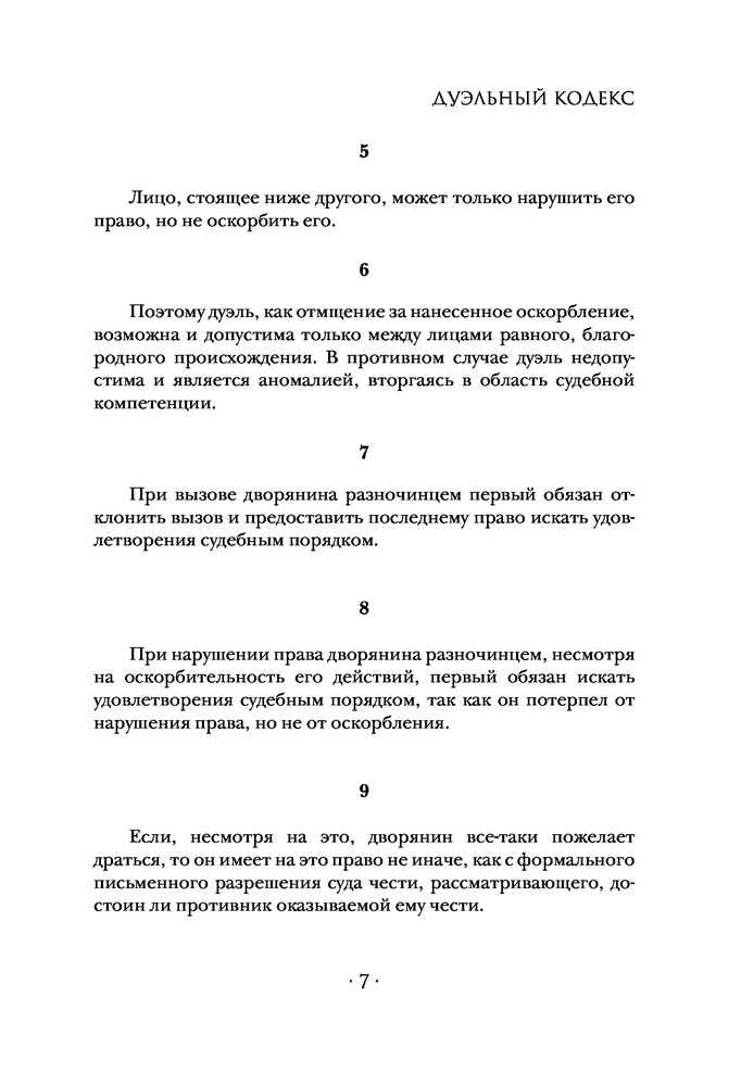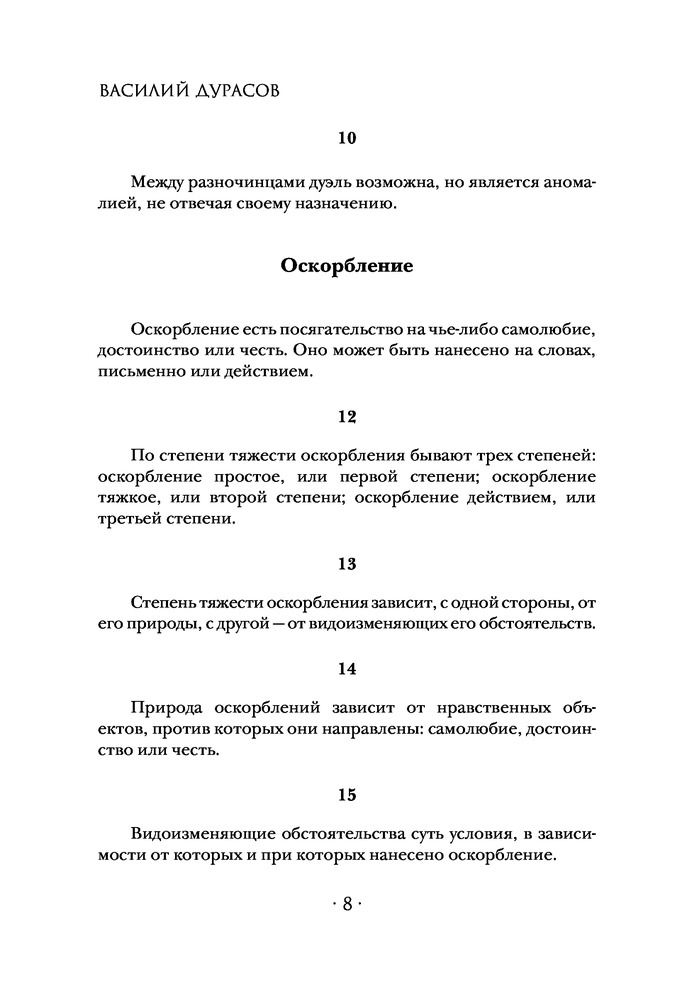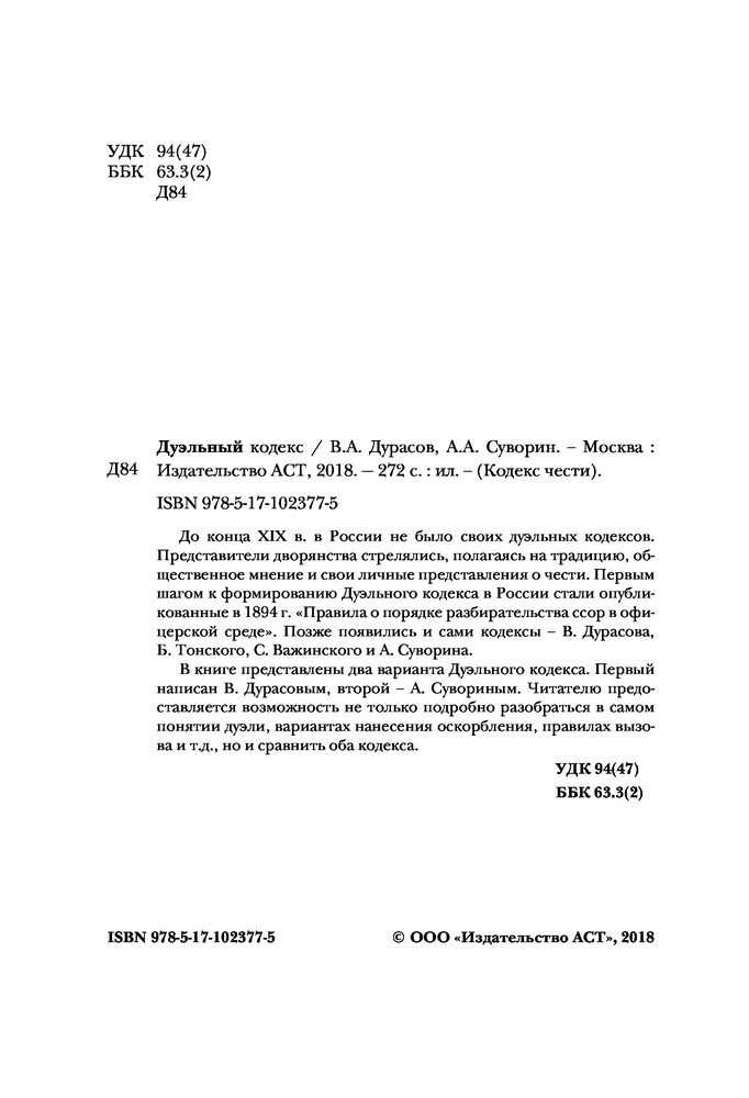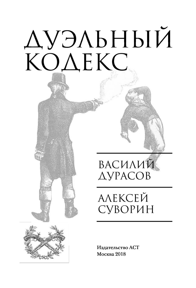Дуэльный кодексСуворин Алексей Сергеевич, Василий Алексеевич Дурасов В данный момент этот товар отсутствует в продаже. Возможно, у нас найдется аналогичный или похожий товар здесь. Серия: Кодекс чести ?До конца XIX в. в России не было своих дуэльных кодексов. Представители дворянства стрелялись, полагаясь на традицию, общественное мнение и свои личные представления о чести. Первым шагом к формированию Дуэльного кодекса в России стали опубликованные в 1894 г. «Правила о порядке разбирательства ссор в офицерской среде». Позже появились и сами кодексы — В. Дурасова, Б. Тонского, С. Важинского и А. Суворина. В книге представлены два варианта Дуэльного кодекса. Первый написан В. Дурасовым, второй — А. Сувориным. Читателю предоставляется возможность не только подробно разобраться в самом понятии дуэли, вариантах нанесения оскорбления, правилах вызова и т.д., но и сравнить оба кодекса. |