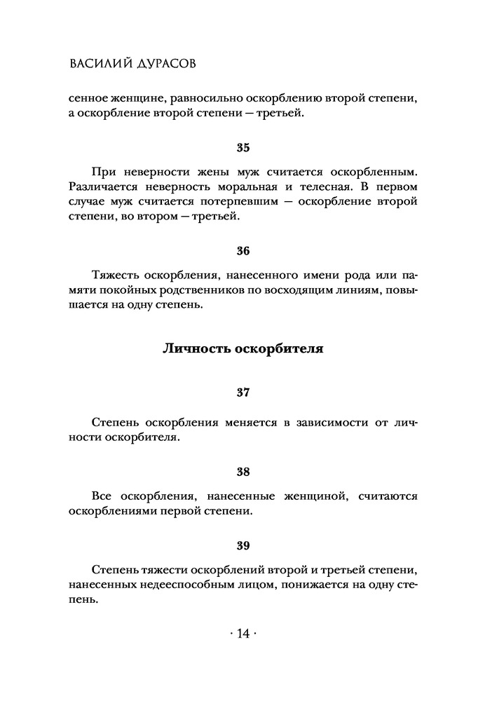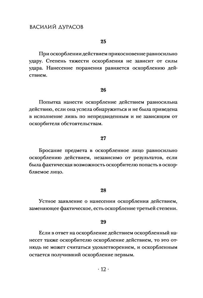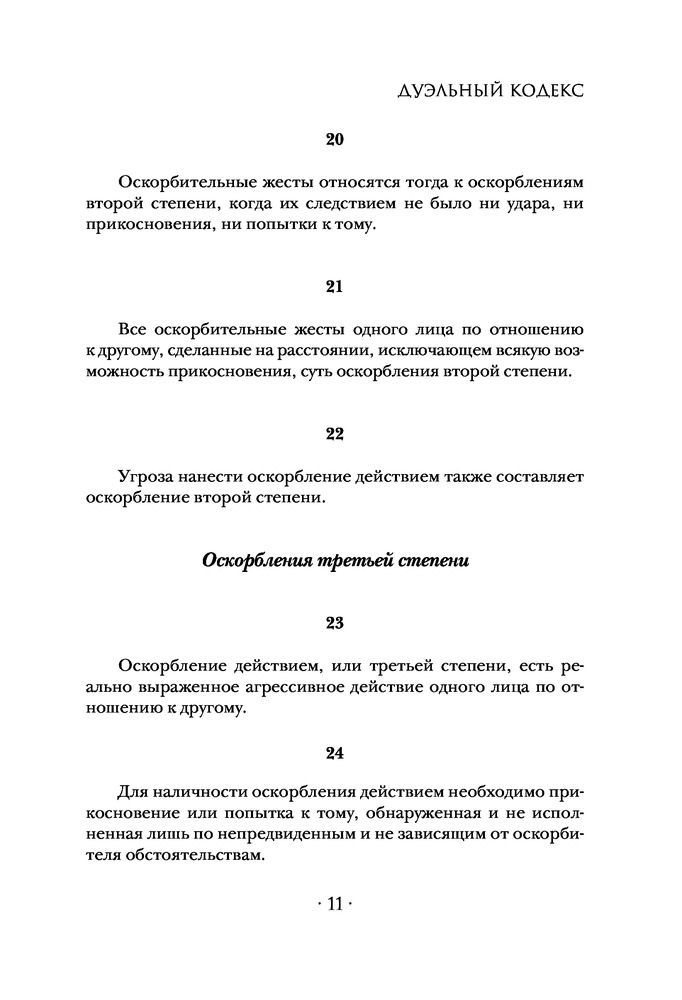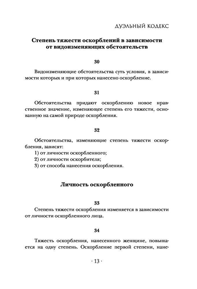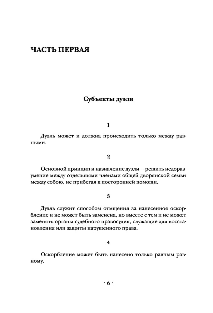 Дуэльный кодексСуворин Алексей Сергеевич, Василий Алексеевич Дурасов В данный момент этот товар отсутствует в продаже. Возможно, у нас найдется аналогичный или похожий товар здесь. Серия: Кодекс чести ?До конца XIX в. в России не было своих дуэльных кодексов. Представители дворянства стрелялись, полагаясь на традицию, общественное мнение и свои личные представления о чести. Первым шагом к формированию Дуэльного кодекса в России стали опубликованные в 1894 г. «Правила о порядке разбирательства ссор в офицерской среде». Позже появились и сами кодексы — В. Дурасова, Б. Тонского, С. Важинского и А. Суворина. В книге представлены два варианта Дуэльного кодекса. Первый написан В. Дурасовым, второй — А. Сувориным. Читателю предоставляется возможность не только подробно разобраться в самом понятии дуэли, вариантах нанесения оскорбления, правилах вызова и т.д., но и сравнить оба кодекса. |