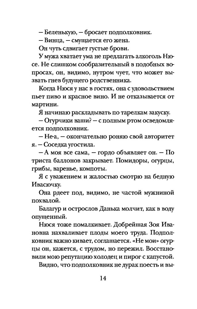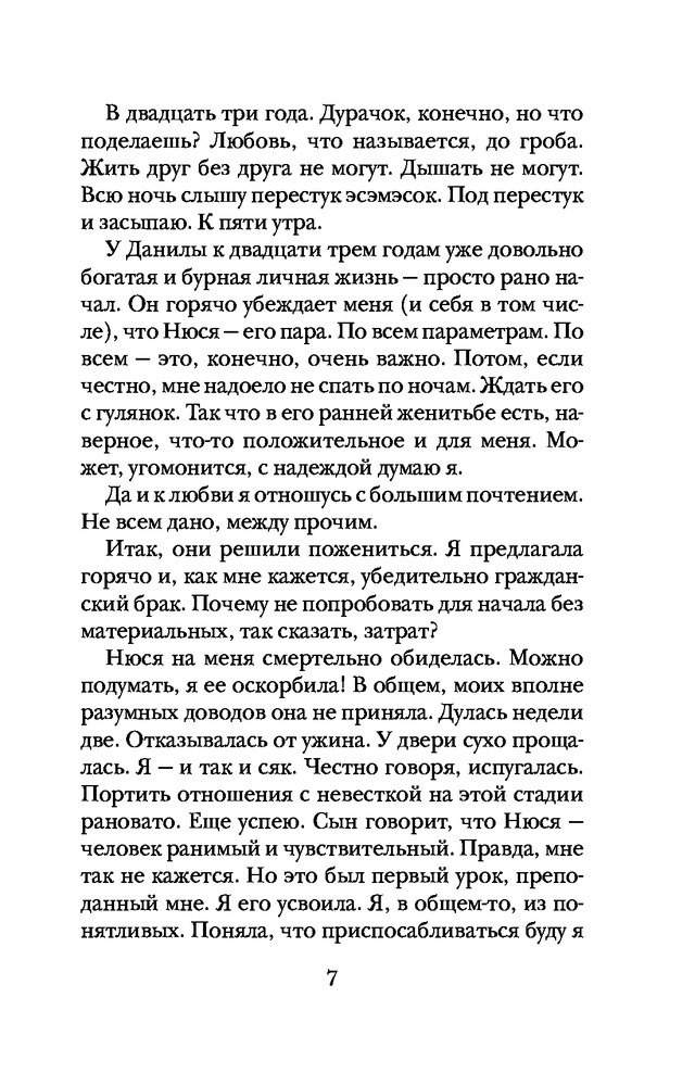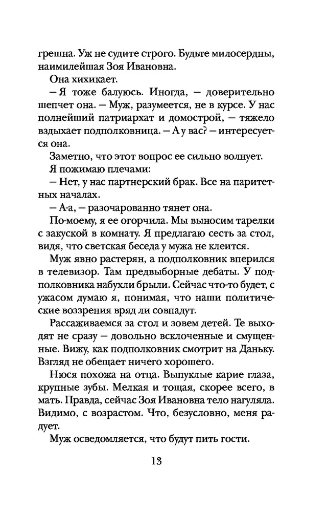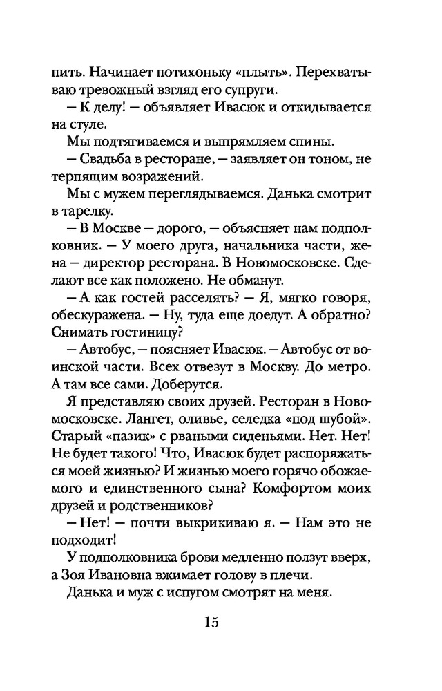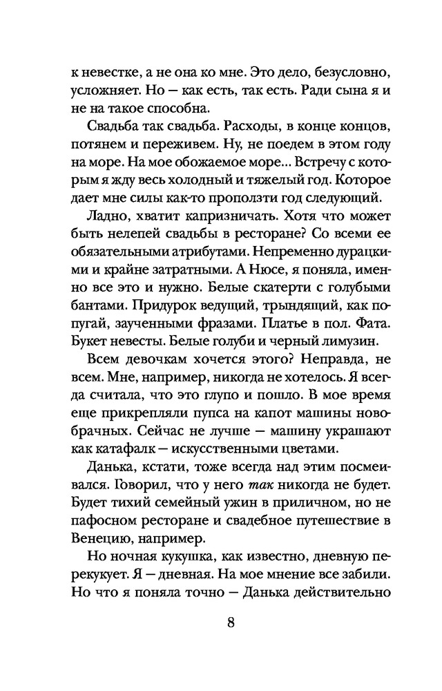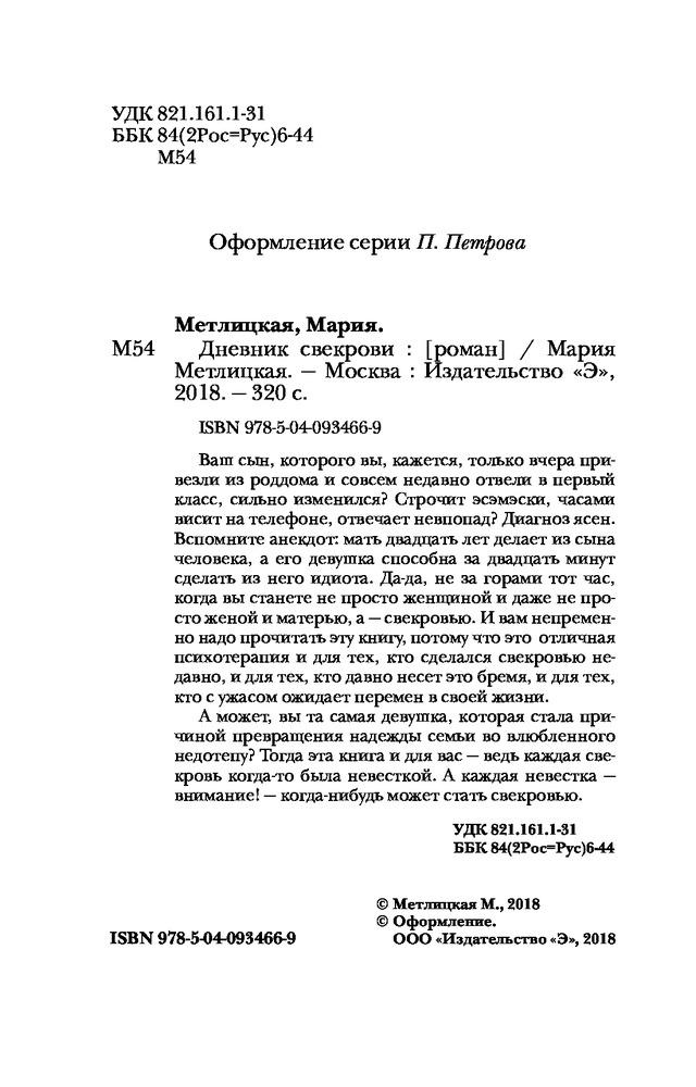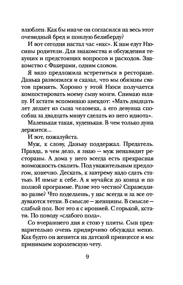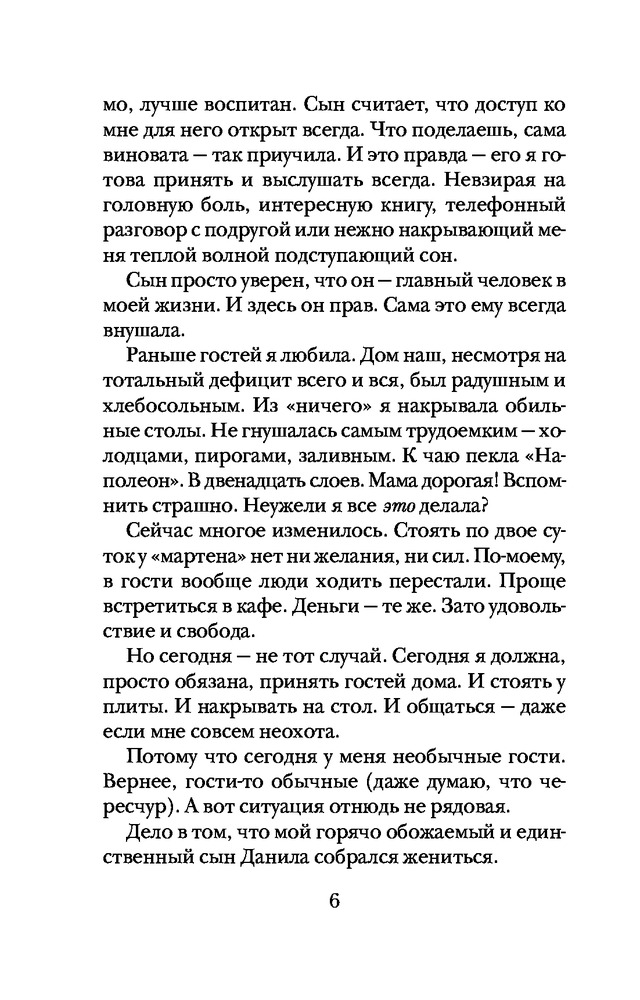 Дневник свекровиВ данный момент этот товар отсутствует в продаже. Возможно, у нас найдется аналогичный или похожий товар здесь. Серия: Женские судьбы. Уютная проза М.Метлицкой(обл) Ваш сын, которого вы, кажется, только вчера привезли из роддома и совсем недавно отвели в первый класс, сильно изменился? Строчит эсэмэски, часами висит на телефоне, отвечает невпопад? Диагноз ясен. Вспомните анекдот: мать двадцать лет делает из сына человека, а его девушка способна за двадцать минут сделать из него идиота. Да-да, не за горами тот час, когда вы станете не просто женщиной и даже не просто женой и матерью, а — свекровью. И вам непременно надо прочитать эту книгу, потому что это отличная психотерапия и для тех, кто сделался свекровью недавно, и для тех, кто давно несет это бремя, и для тех, кто с ужасом ожидает перемен в своей жизни. |