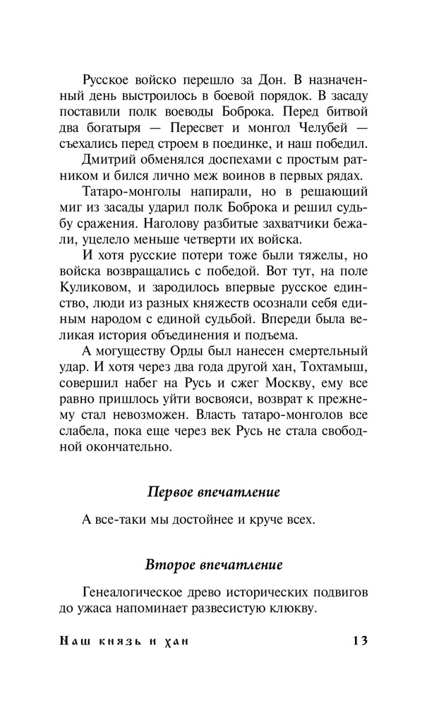 Наш князь и ханВ данный момент этот товар отсутствует в продаже. Возможно, у нас найдется аналогичный или похожий товар здесь. Серия: Веллер: избранное Роман из времен Куликовской битвы превращается в цепь нелепостей, а сюжет — в головоломку разведчика, вскрывающего тайны. Русская история была фальсифицирована пиарщиками Средневековья. Сражение с Мамаем и карательный набег Тохтамыша выглядели вовсе не так, как нам внушали веками. И сами мы — не те, кем себя считали... |