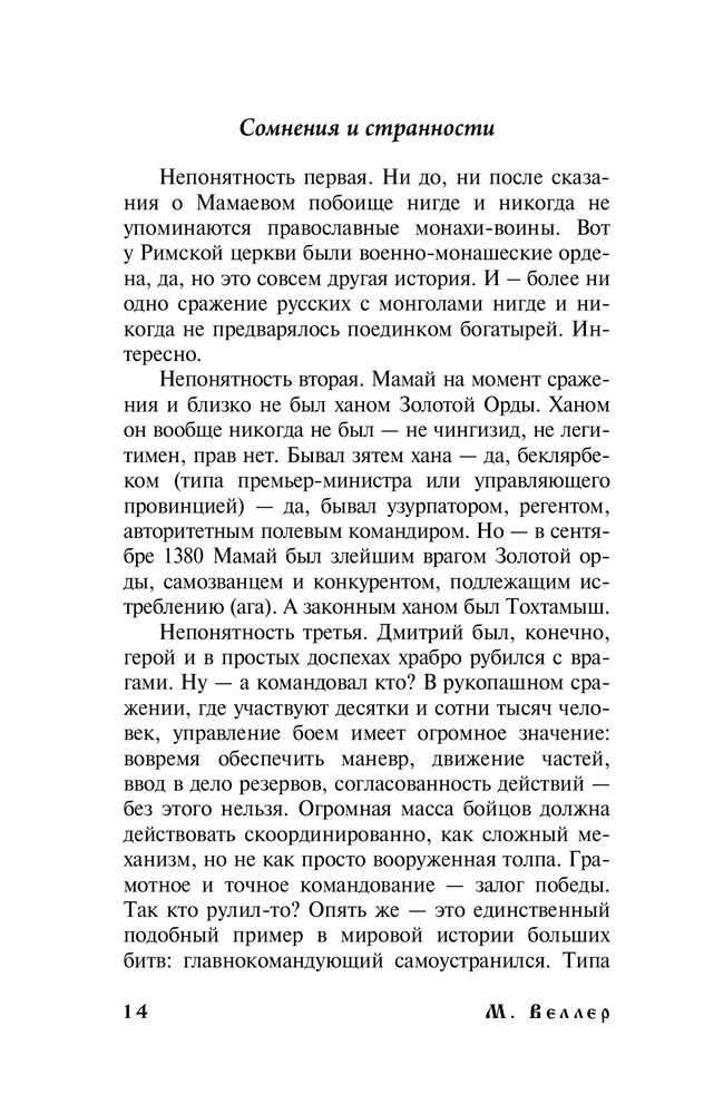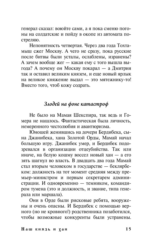 Наш князь и ханВ данный момент этот товар отсутствует в продаже. Возможно, у нас найдется аналогичный или похожий товар здесь. Серия: Странник и его страна Роман из времен Куликовской битвы превращается в цепь нелепостей, а сюжет — в головоломку разведчика, вскрывающего тайны. Русская история была фальсифицирована пиарщиками Средневековья. Сражение с Мамаем и карательный набег Тохтамыша выглядели вовсе не так, как нам внушали веками. И сами мы — не те, кем себя считали... |