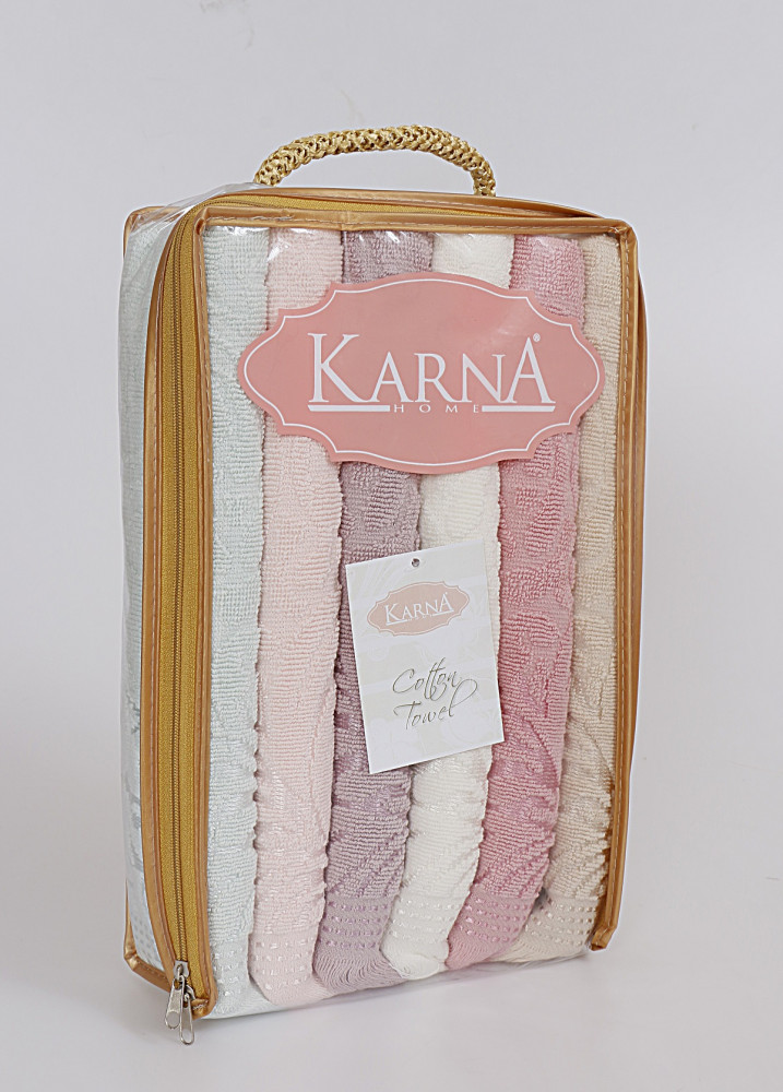 Karna Салфетки махровые «KARNA» (хлопок, 40x60 см - 6 шт)В данный момент этот товар отсутствует в продаже. Возможно, у нас найдется аналогичный или похожий товар здесь. Серия: Esra Салфетки махровые изготавливают из высококачественных хлопковых нитей. Хлопковые нити прядутся из длинных волокон. Длина волокон хлопковой нити влияет на свойства ткани, чем длиннее волокна, тем махровое изделие прочнее, пушистее и мягче на ощупь. А также махровое изделие будет отлично впитывать воду и быстро сохнуть. На впитывающие качества махры (ее гигроскопичность) конечно же влияет состав волокон. Махра абсолютно не аллергена, имеет высокую воздухопроницаемость и долгий срок использования ткани. Отличительной особенностью данной модели является её оригинальный рисунок (вышивка). Декор в виде вышивки и бахромы хорошо смотрится. Вышитые изображения отличаются своей долговечностью и практичностью, они не выгорают и не линяют. |