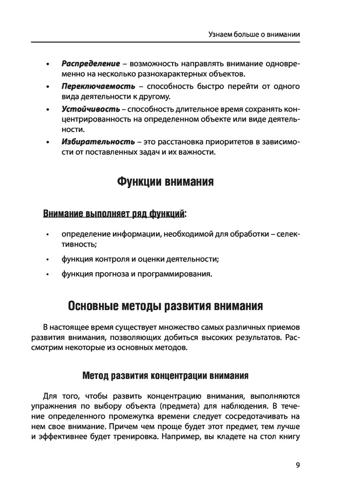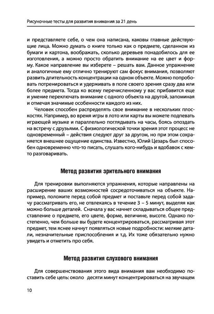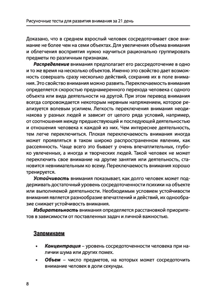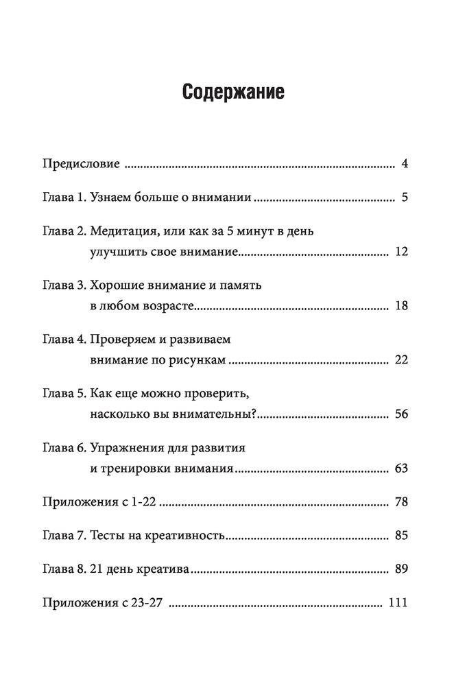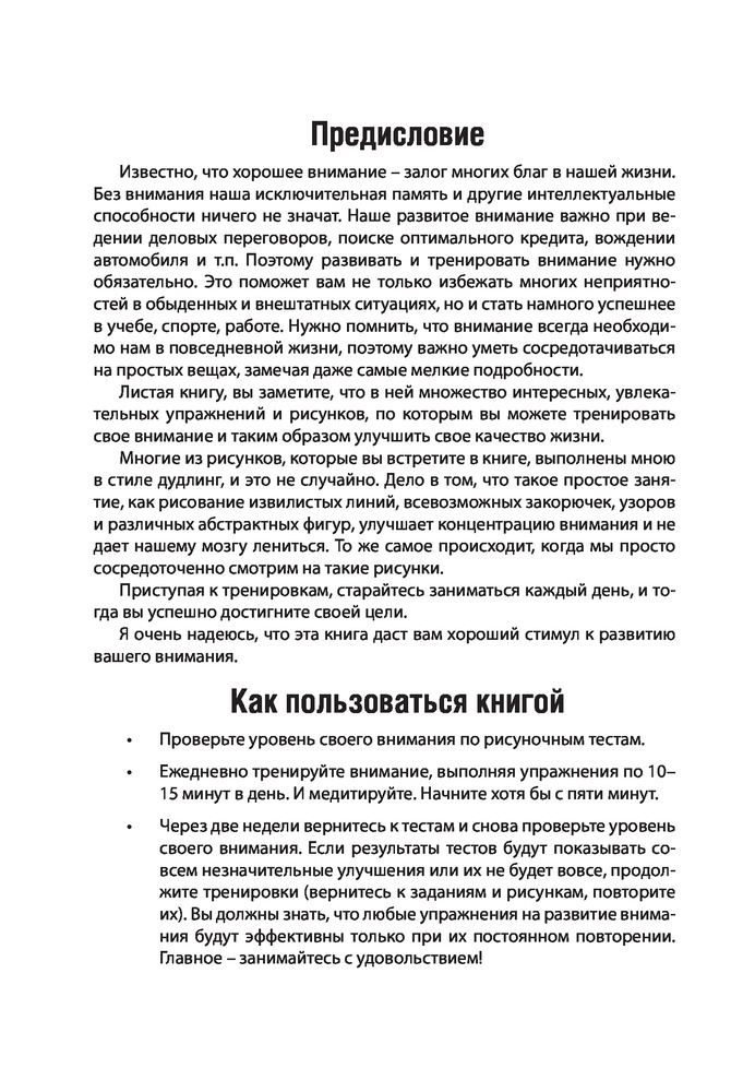 Всем известно, что внимание нужно развивать и тренировать постоянно, так же как и память. В книге вы найдете тесты на проверку внимания, упражнения и рисунки, которые позволят тренировать и совершенствовать память, а также задания на развитие креативности. Благодаря таким упражнениям вы сможете: