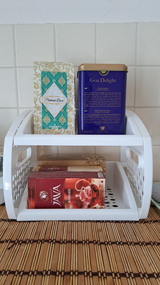 Полочку взяли на кухонный стол под мелочь, удобно на ней всё ставить, на столе порядок