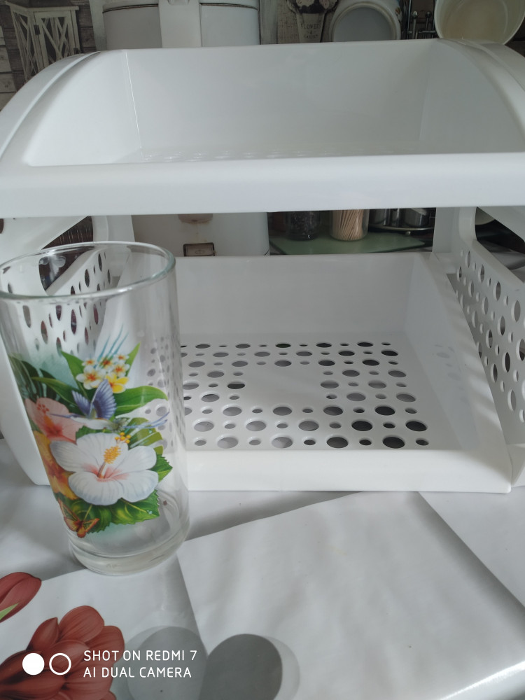 Крепкая, устойчивая этажерка. Но бортики слишком широкие. За счет этого не используется такое нужное место. Ведь этажерку ставишь, чтобы больше уместилось, а тут по два пальца с каждой стороны уходит просто для бортиков. Такое решение было бы оправдано для 4-5-этажной этажерки, а тут сколько сэкономил места, почти столько и ушло на бортики.