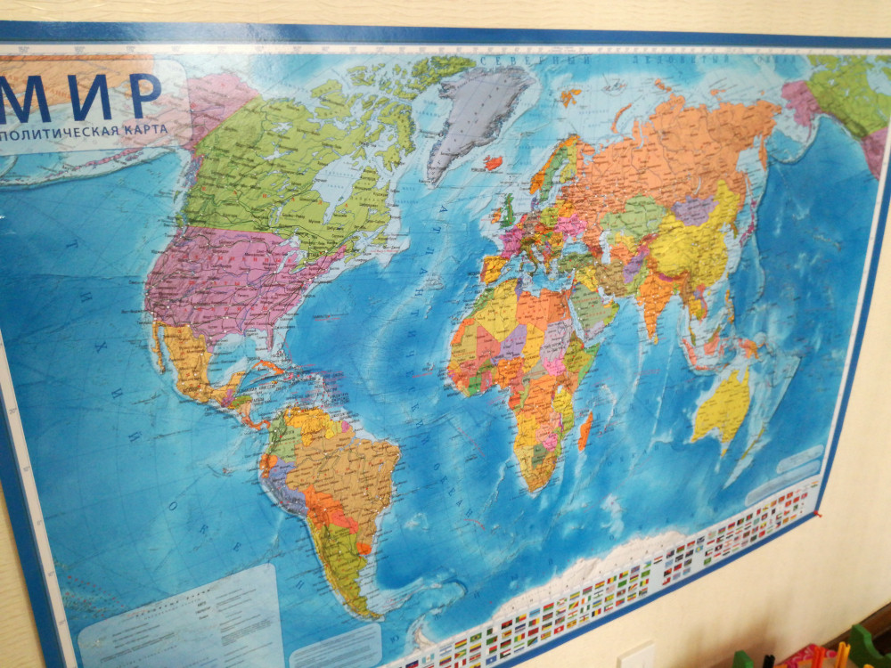 Классная карта, повесили на стену в детской. Впечатлили картинки флагов неизвестных мне ранее стран. Упаковка в виде крепкой тубы с железными крышками также очень впечатлила.