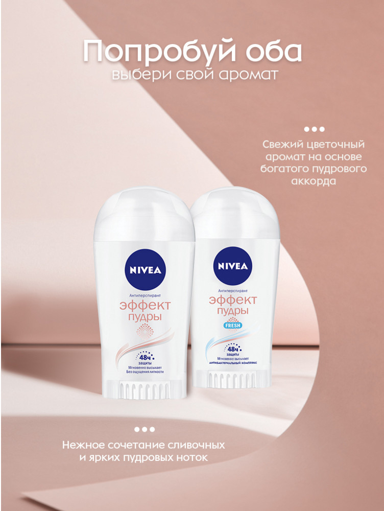 NIVEA Дезодорант-антиперспирант твердыйВ данный момент этот товар отсутствует в продаже. Возможно, у нас найдется аналогичный или похожий товар здесь. Серия: Эффект пудры Дезодорант-антиперспирант сочетает в себе надежную защиту антиперспирирующей формулы и невероятную мягкость уникального природного компонента — каолиновой пудры. Каолин, также известный как «Белая глина», обладает отличными абсорбирующими и обволакивающими свойствами, поэтому сразу после нанесения дезодорант мгновенно высыхает, не оставляя липких ощущений на коже, и придает ей невероятную мягкость. Дезодорант обладает нежным свежим цветочным ароматом на основе богатого пудрового аккорда. |