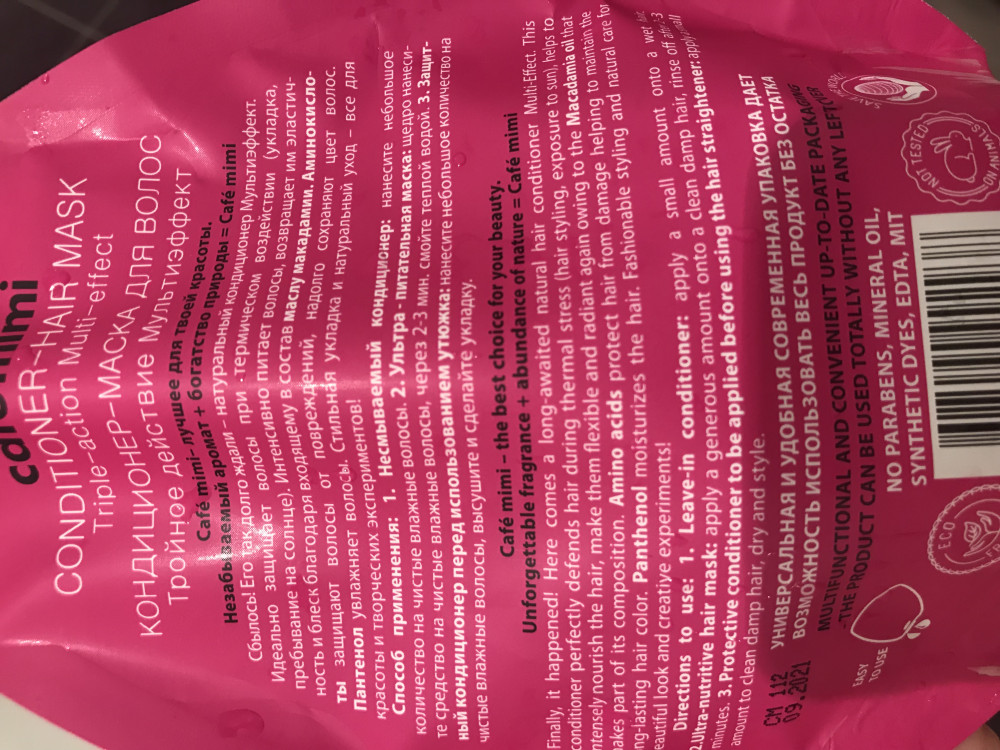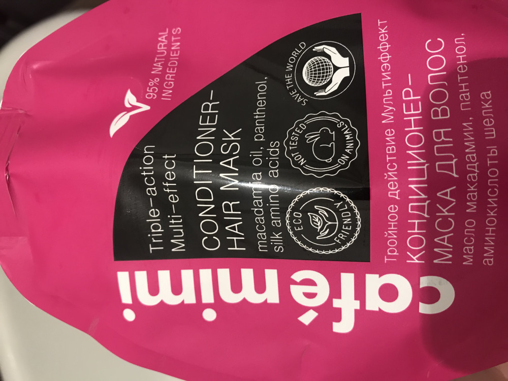 Не вау. Сразу скажу, что у меня длинные осветлённые (читай сожженые) волосы. Осветление не от корней, поэтому часть волос живые. Я использовала сначала как маску, оставила минут на 10. Эффекта 0...вообще...никакого...По консистенции кондиционер очень легкий, не жирный. На мою длину нужно очень много наносить, чтобы был эффекта-но его не было один фиг. Далее я смыла маску и нанесла повторно небольшое количество, чтобы не смывать (как в инструкции). После высушивания феном результат меня не порадовал: волосы как были соломой, так ей и остались. Единственный + это то, что мои живые волосы стали чуть тяжелее, и пригладились торчащие мелкие волоски (которые как у одуванчика). На фото пыталась передать эффект, если присмотреться то от корней более менее гладкий волос. Все остальное солома торчащая. Вывод: буду использовать только когда обрежу свои сожженые волосы. Мне не подошло. (Во избежании вопросов: для моих волос подошла маска из этой же серии, так же cafe mimi, упаковка жёлтая, называется 1 минута или что-то типо того. От неё эффект просто бомбический: Волосы как шёлк, гладенькие, мягонькие, идеально расчесываются и укладываются). Это средство 4/10. Для осветлённых точно нет. Если у тебя натуральные волосы, то эффект будет. Спасибо, что дочитали.