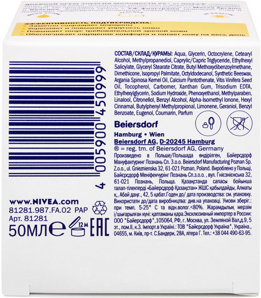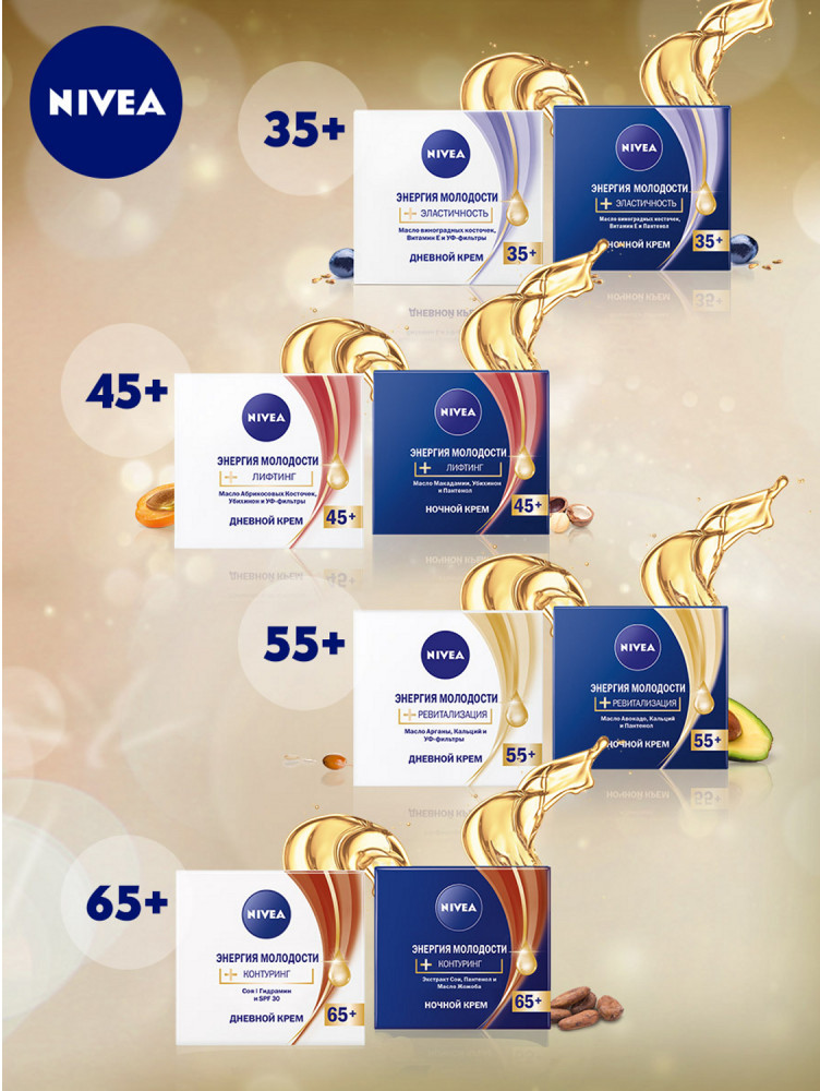 NIVEA Крем дневной «Энергия Молодости» 55+быстро впитывается увлажнение приятный аромат под макияж подтягивающий эффект В данный момент этот товар отсутствует в продаже. Возможно, у нас найдется аналогичный или похожий товар здесь. Серия: Anti-Wrinkle Дневной крем «Энергия Молодости» повышает тонус зрелой кожи, интенсивно увлажняет и борется с морщинами изнутри. Он обогащен энергетическим коктейлем из масла арганы и кальция. Формула крема с УФ-фильтрами защищает кожу и позволяет предотвратить появление новых морщин. |