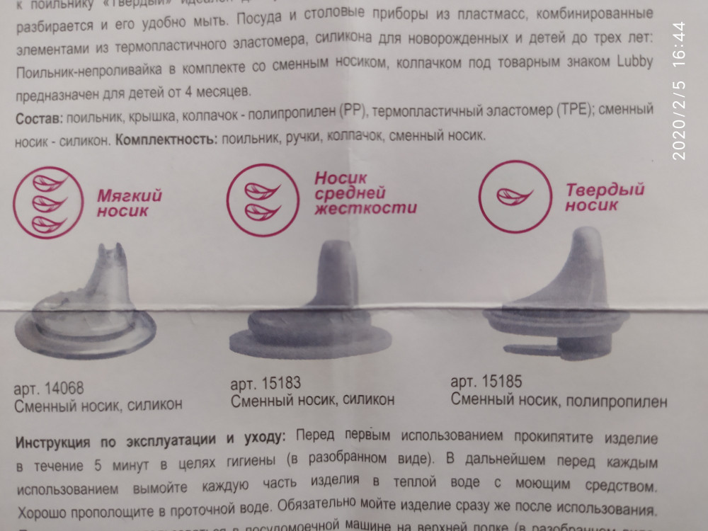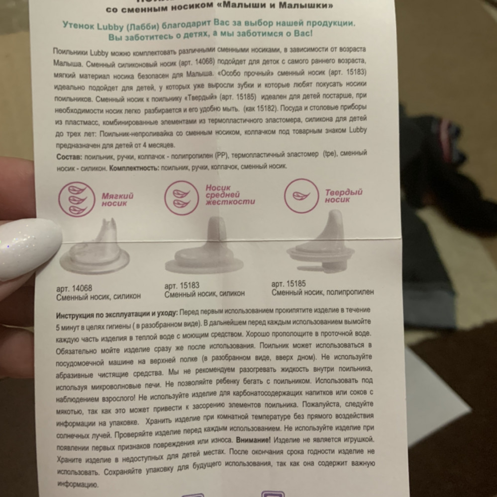 заказала данный поильник для того, чтобы кормить ребенка йогуртом, кефиром. идущий в комплекте к поильнику носик имеет слишком маленькое отверстие и не позволяет поить ребенка ничем кроме воды либо сока. уже когда получила товар в инструкции увидела, что к данному поильнику применимы три вида носиков: "мягкий" (идущий в комплекте), "носик средней жёсткости" (можно отдельно купить на сайте) и "твердый" (его в ассортименте товаров на сайте не увидела). мне нужен был средний носик, придется покупать его отдельно. стоит он больше половины стоимости поильника, что очень огорчает((( хотелось бы видеть информацию о носике в описании товара, а пока надеюсь, что мой отзыв окажется полезным для тех, кто стоит перед выбором поильника для своего малыша